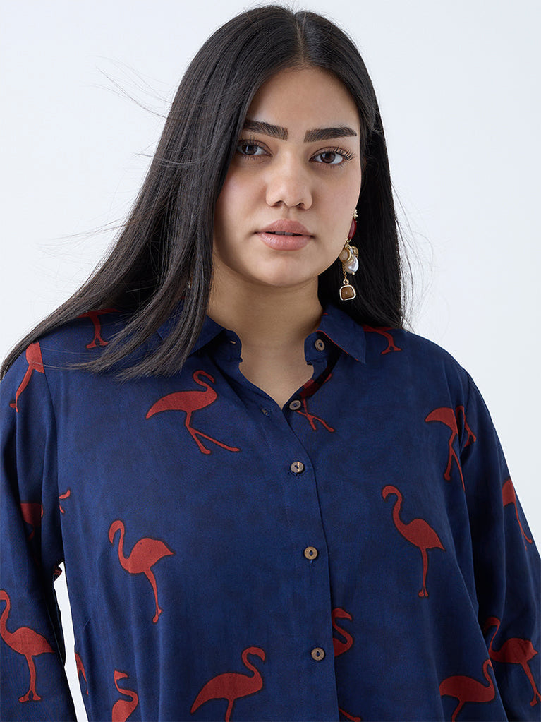 Bring a playful twist to your ethnic wardrobe with this navy kurta from Diza. Fashioned with a lively flamingo print, it’s cut in a flattering A-line frame and styled with a collar, button placket, flared sleeves, and a slip pocket.