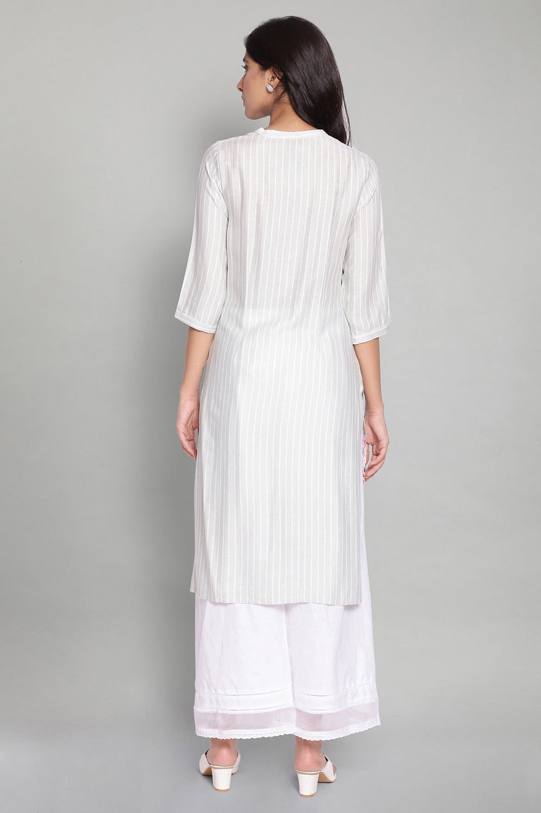 Elevate your casual wardrobe with this exquisite white floral printed kurta. Crafted using a woven construction technique, this ethnic piece combines style and comfort effortlessly. The straight silhouette flatters various body types, while the band neckline adds a touch of sophistication. The three-quarter sleeve length is perfect for both warm and cool weather, making it a versatile choice for year-round wear. Made from a blend of 60% rayon, 32% cotton, and 8% flax, this kurta offers breathability and durability. The addition of flax in the fabric composition enhances its texture and gives it a unique appeal. The floral print adds a feminine touch to the overall design, making it suitable for various casual occasions. Whether you're attending a family gathering or running errands, this kurta will keep you looking stylish and feeling comfortable throughout the day.