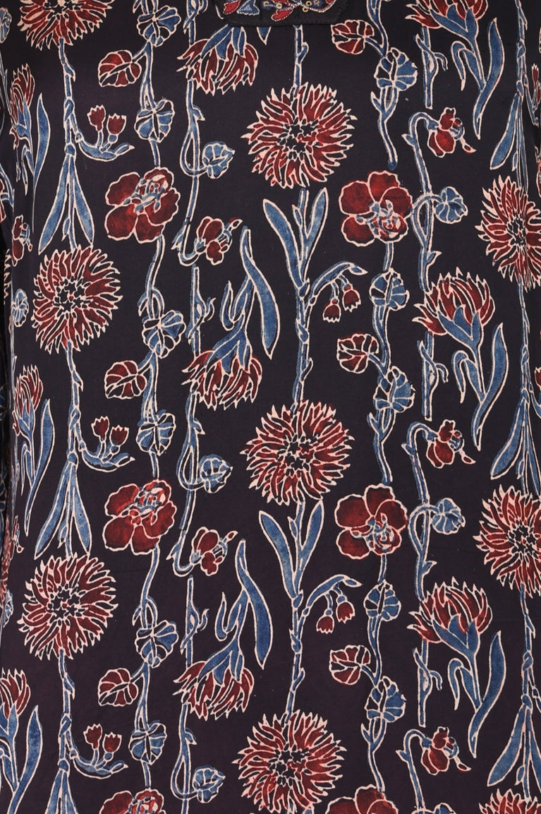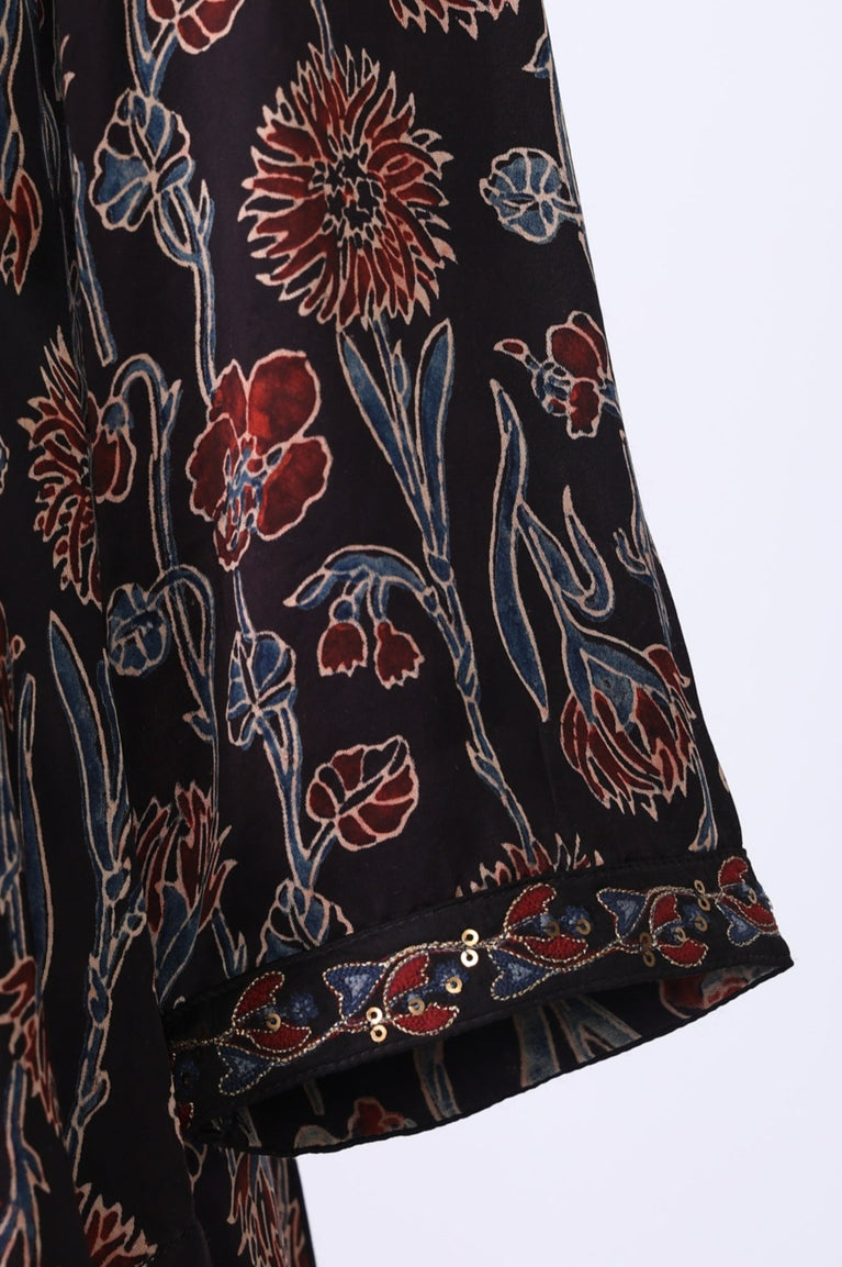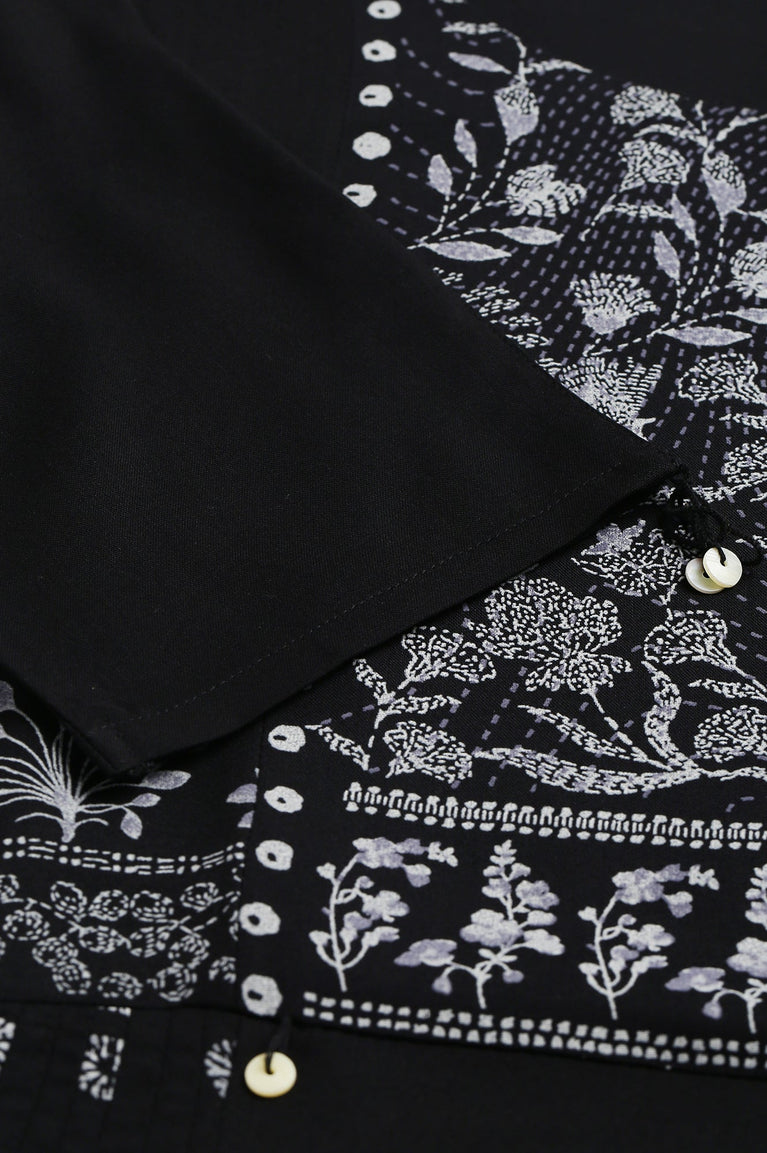 Black Floral Side Pleated kurta In Round Neck