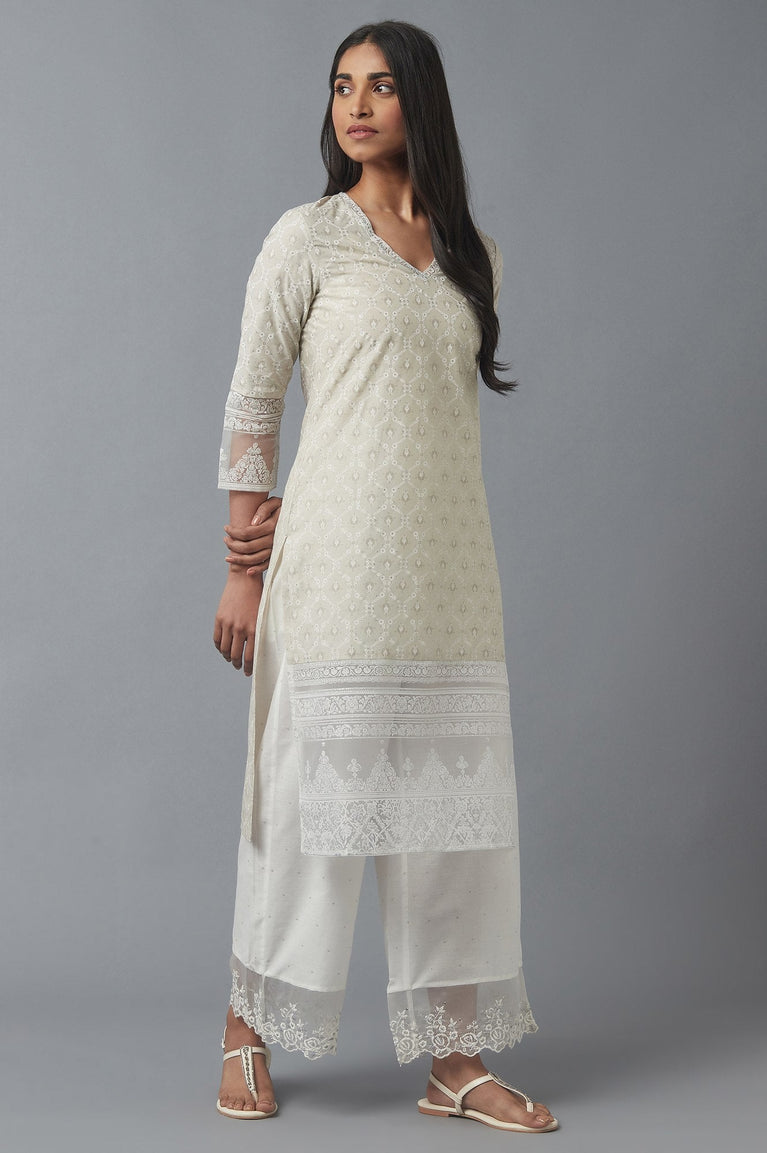 Green Print Mix Straight kurta Set. The Set Includes Green Straight kurta In Round Neckline. It Is Paired With White Lace Slim Pants.