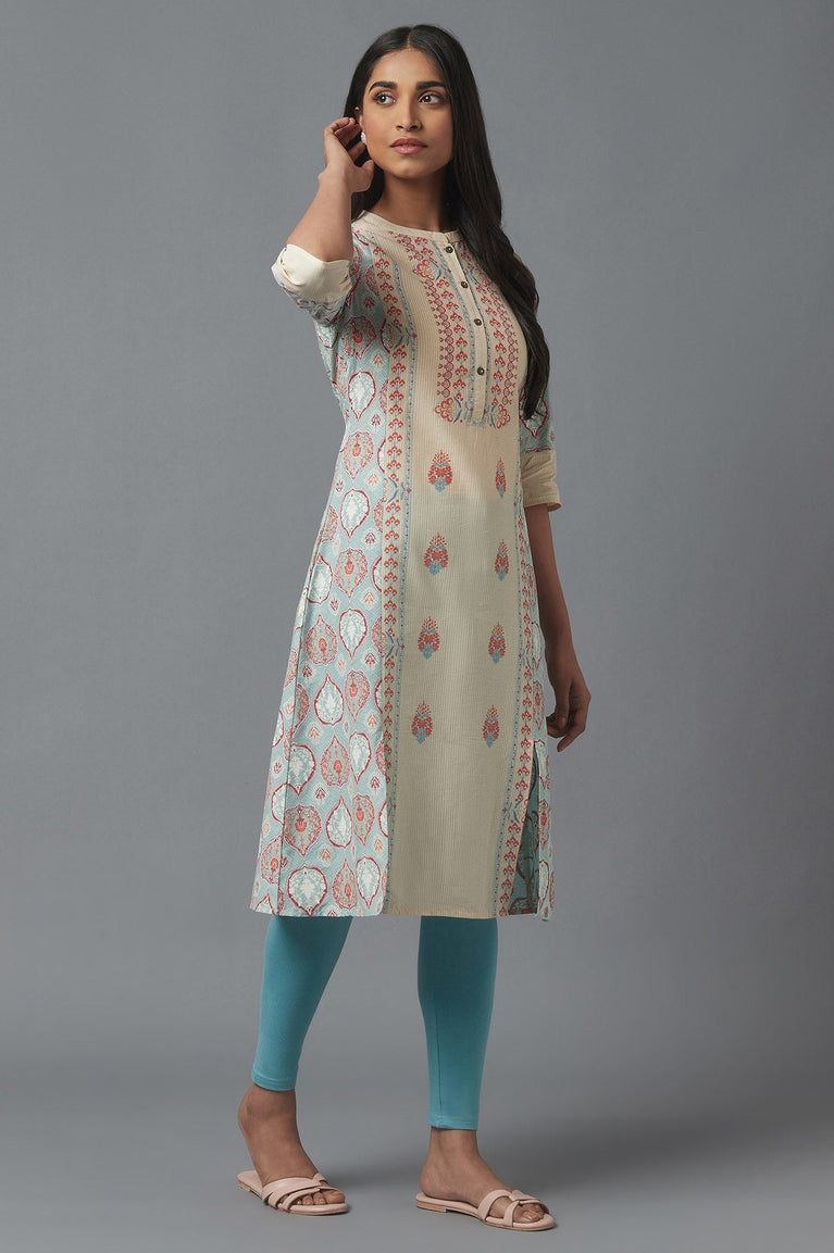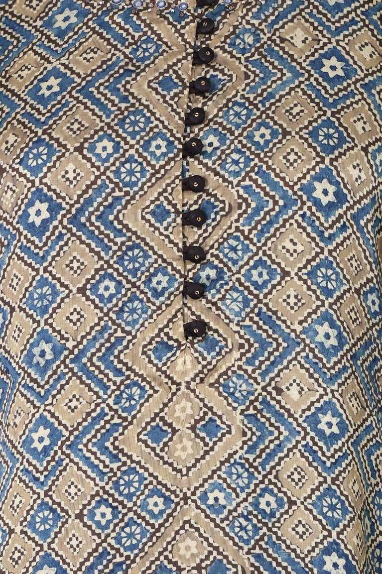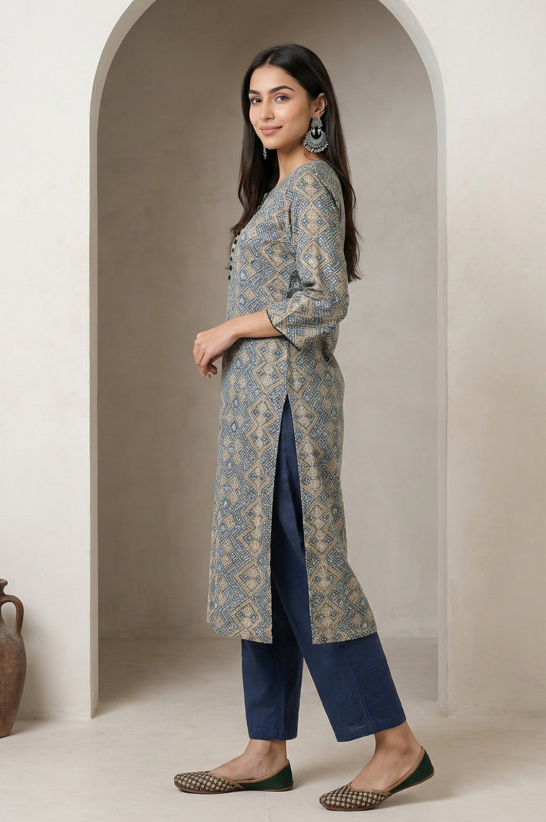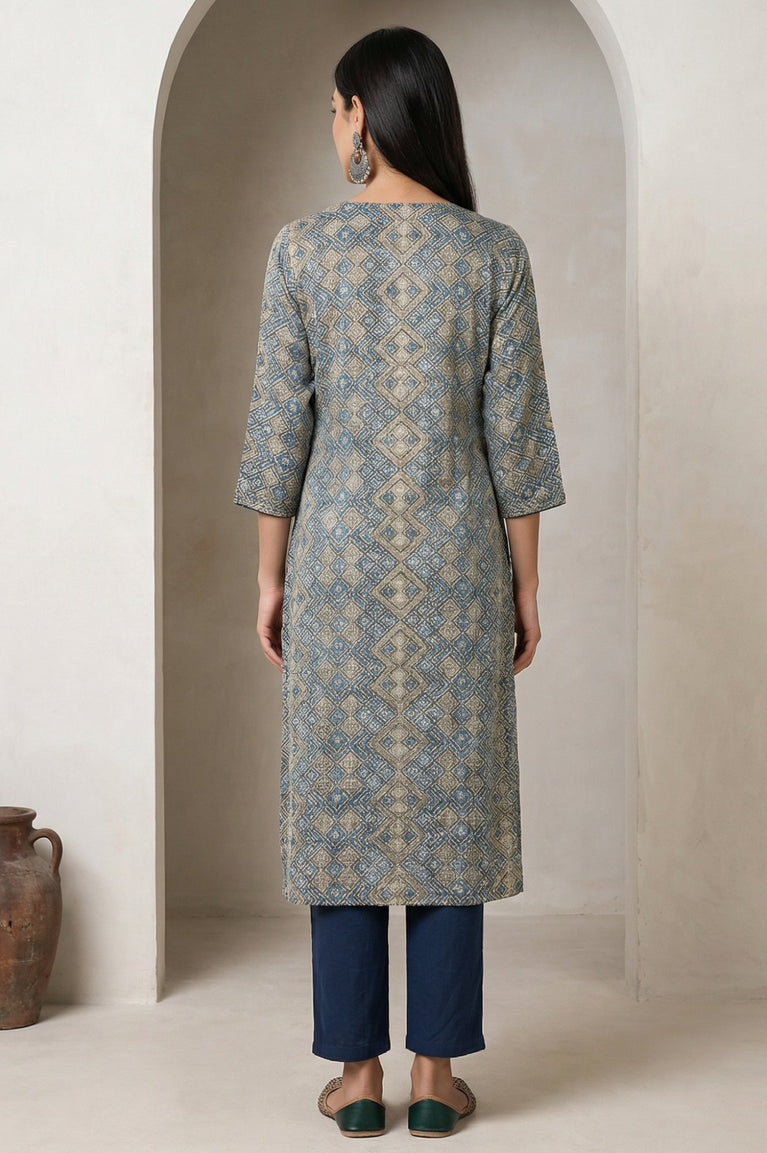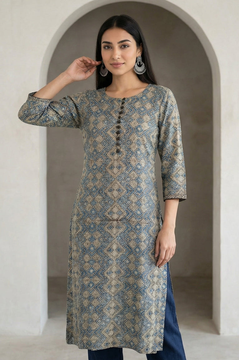 Folksong beige and blue modal satin printed kurta with mirror work brings a polished straight silhouette for smart casual days. The allover geometric diamond print, round neck and three-quarter sleeves keep it easy yet elevated, finished with side slits and a straight hem for fluid movement in Indian ethnic wear.
