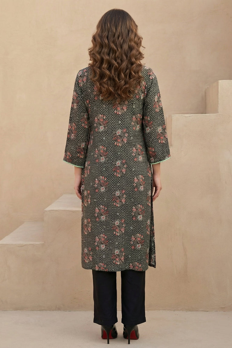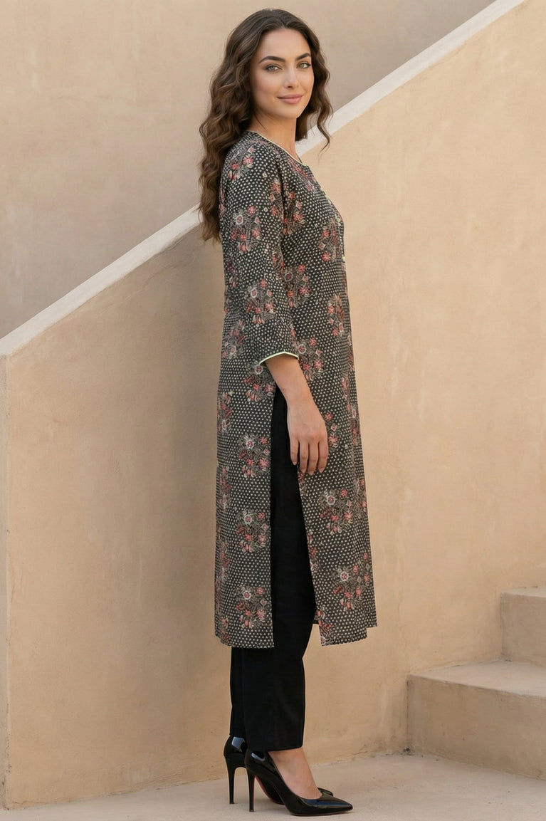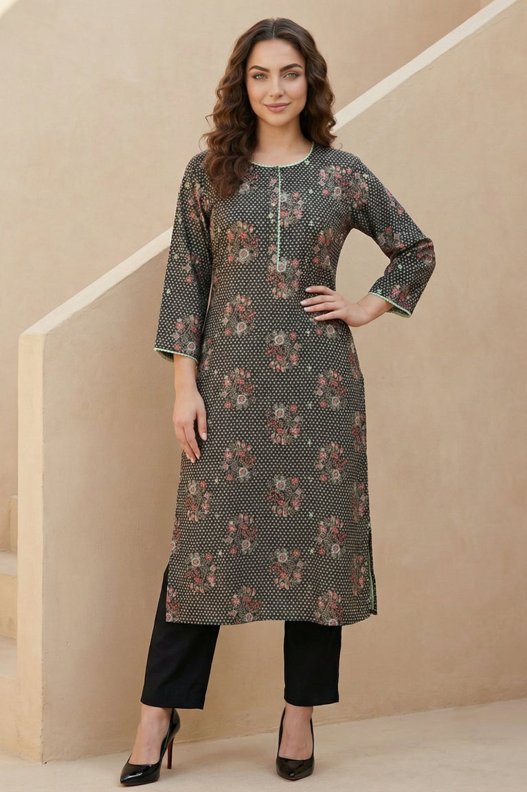Crisp-yet-fluid elegance awaits you in this stunning piece. This Black Floral Printed Kurta from W for Woman is the epitome of effortless style, designed to seamlessly transition from your morning meeting to an evening gathering. The silhouette that flatters while it flows, this straight-cut kurta is tailored from premium 100% Viscose Rayon, ensuring a soft touch and breathable comfort throughout the Summer 2026 season. Adorned with a captivating all-over print featuring delicate floral bunches and geometric dots, the design radiates a contemporary ethnic vibe. The smart round neckline is accentuated with a faux placket detailing decorative buttons and fresh green piping, adding a hint of contrast to the dark charcoal base. Three-quarter sleeves with matching trim details provide a polished finish, while the classic side slits offer freedom of movement and a traditional touch. This opaque, woven garment requires no lining, making it lightweight and easy to wear. Whether styled with tailored trousers for a professional look or leggings for a casual day out, this kurta is a versatile addition to your wardrobe. Its timeless shape and intricate pattern make it a must-have for the modern woman seeking both fashion and function.