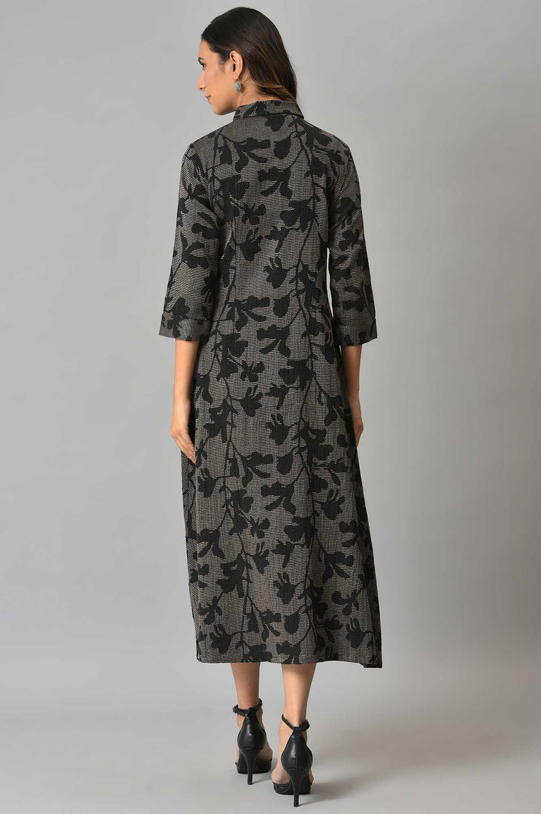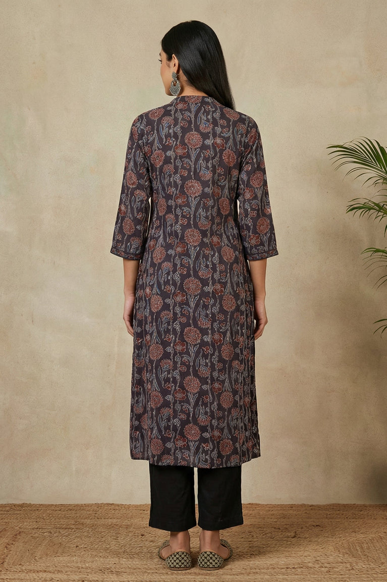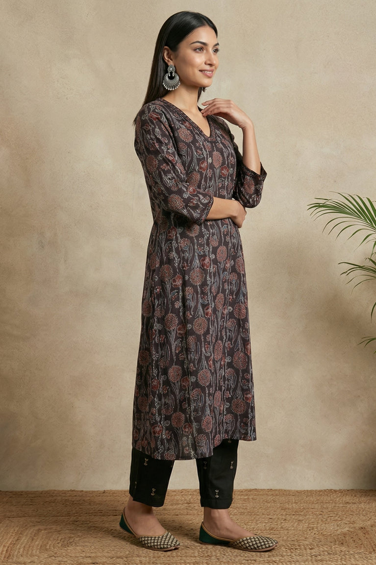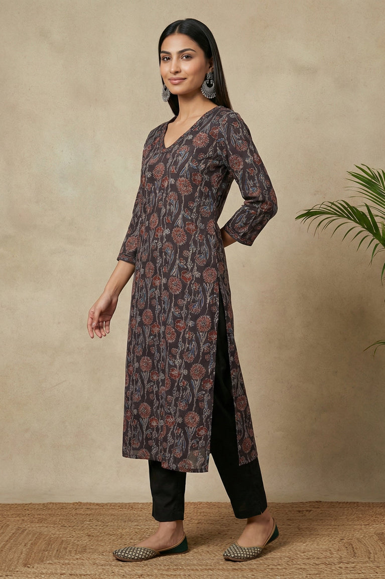Crisp-yet-fluid elegance awaits you in this stunning piece. This Black Floral Printed Kurta from W for Woman is the epitome of effortless style, designed to seamlessly transition from your morning meeting to an evening gathering. The silhouette that flatters while it flows, this straight-cut kurta is tailored from premium 100% Viscose Rayon, ensuring a soft touch and breathable comfort throughout the Summer 2026 season. Adorned with a captivating all-over print featuring delicate floral bunches and geometric dots, the design radiates a contemporary ethnic vibe. The smart round neckline is accentuated with a faux placket detailing decorative buttons and fresh green piping, adding a hint of contrast to the dark charcoal base. Three-quarter sleeves with matching trim details provide a polished finish, while the classic side slits offer freedom of movement and a traditional touch. This opaque, woven garment requires no lining, making it lightweight and easy to wear. Whether styled with tailored trousers for a professional look or leggings for a casual day out, this kurta is a versatile addition to your wardrobe. Its timeless shape and intricate pattern make it a must-have for the modern woman seeking both fashion and function.