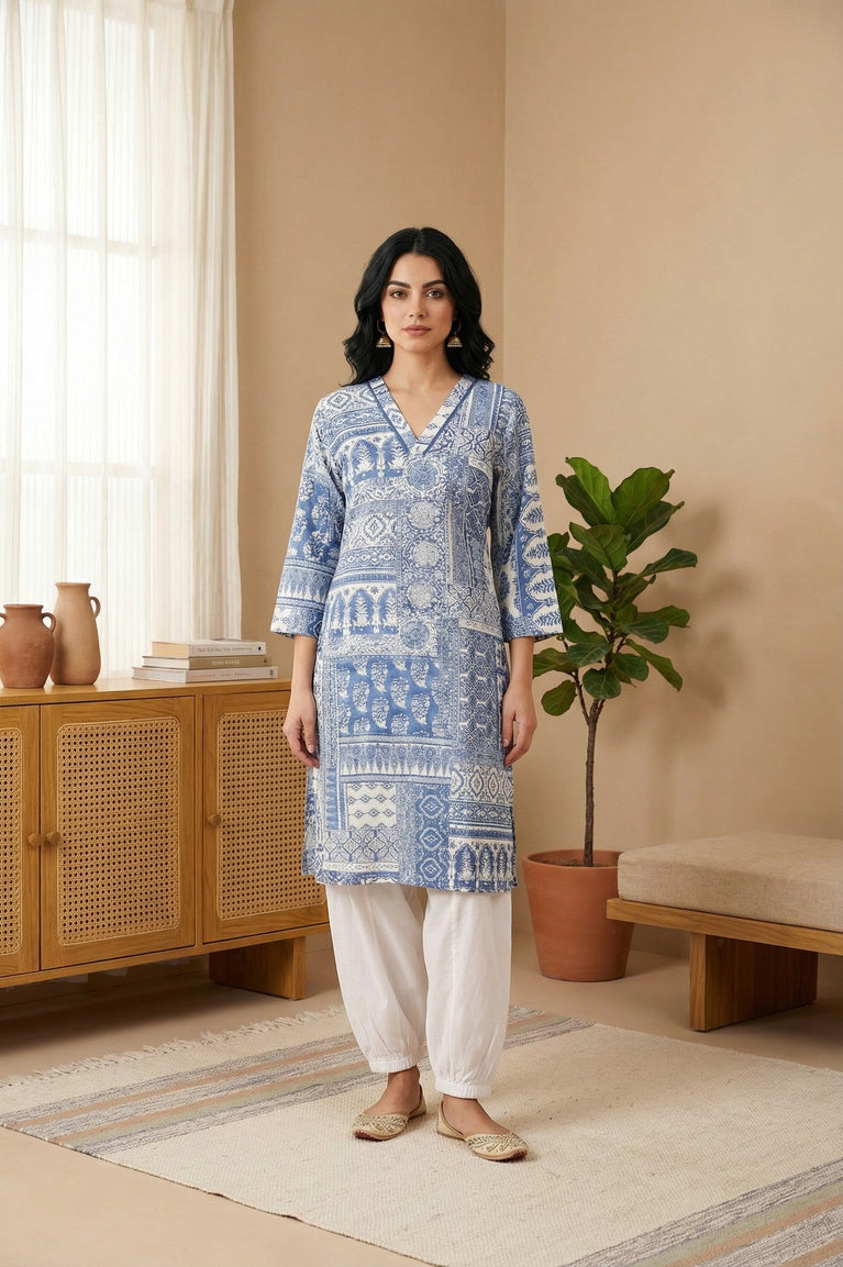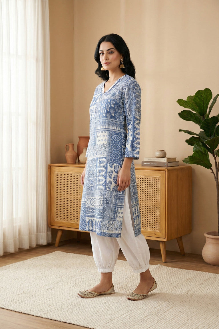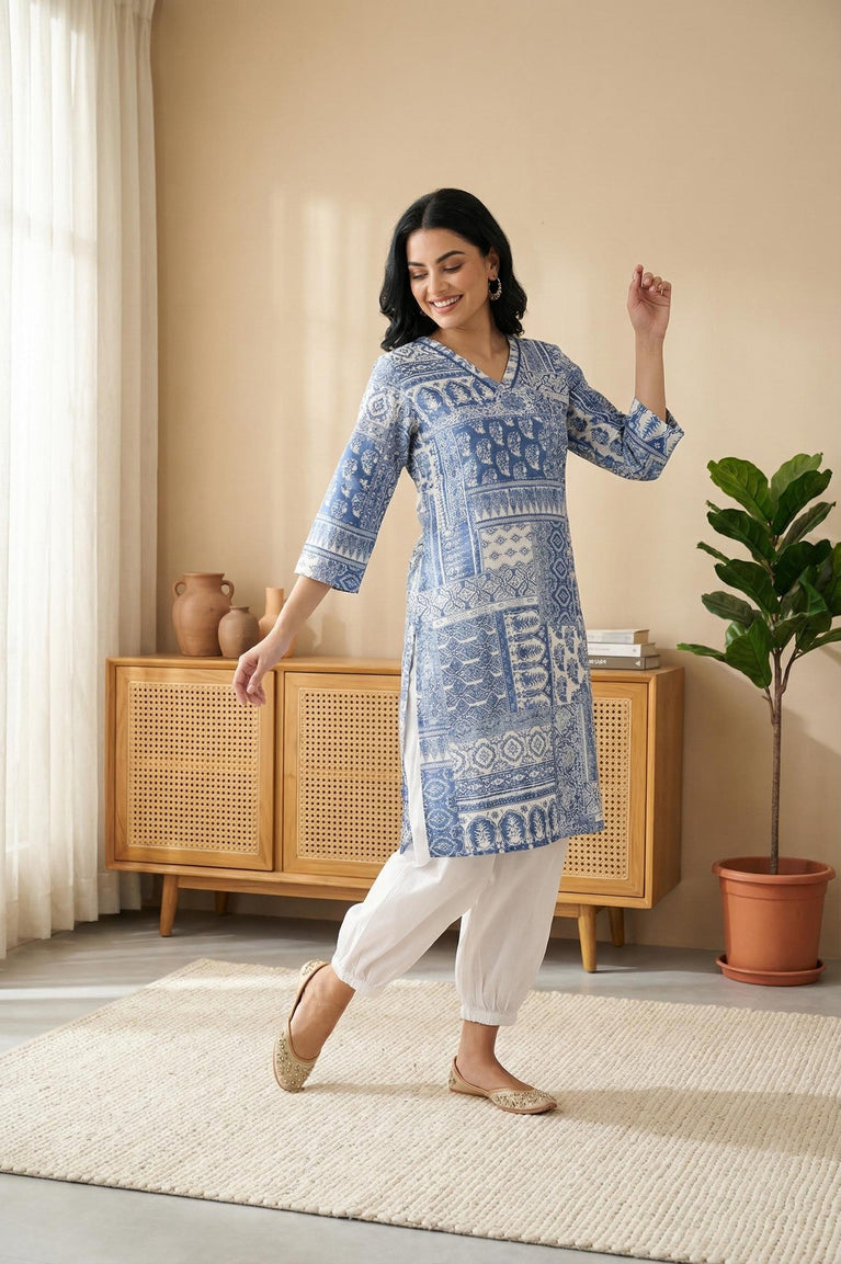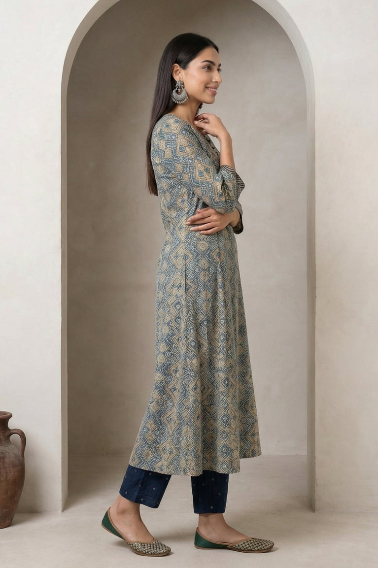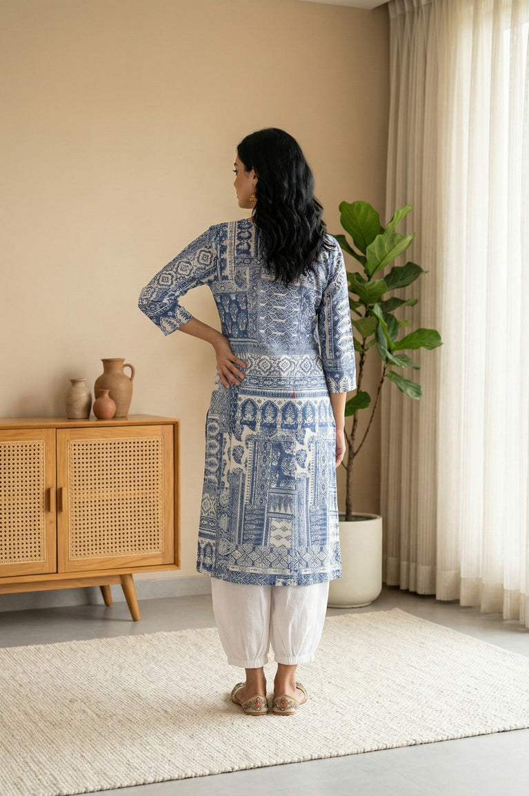 Blue Printed A-Line Kurta