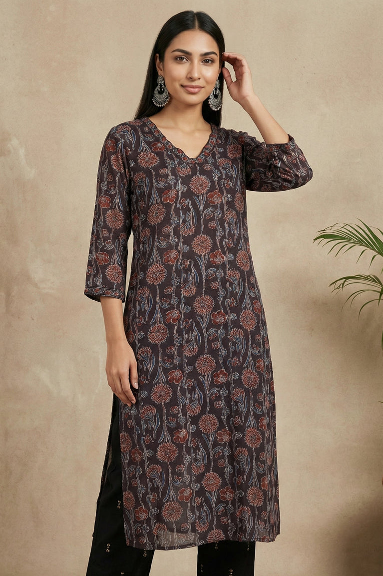 Crafted in rich brown satin with a striking all-over block print, this straight-fit kurta for women is a versatile addition to your smart casual wardrobe. The lightweight woven fabric flows beautifully, while delicate sequin ornamentation adds a hint of subtle shimmer to the V-neckline. Designed with side slits, three-quarter sleeves, and an opaque finish, it offers both comfort and effortless style for daily outings or informal gatherings. Pair this elegant ethnic wear for women with contrasting bottoms for a refined daytime look.