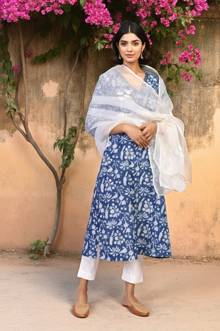 An everyday wardrobe essential, this straight kurta features meticulous handblock printing. It includes striped detailing along the sides and sleeves, complemented by a dori tie-up at the front and delicate sequins along the neckline.