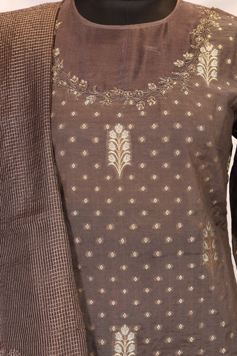 Brown Embroidered Jacquard Straight Kurta with Pants and Dupatta Set