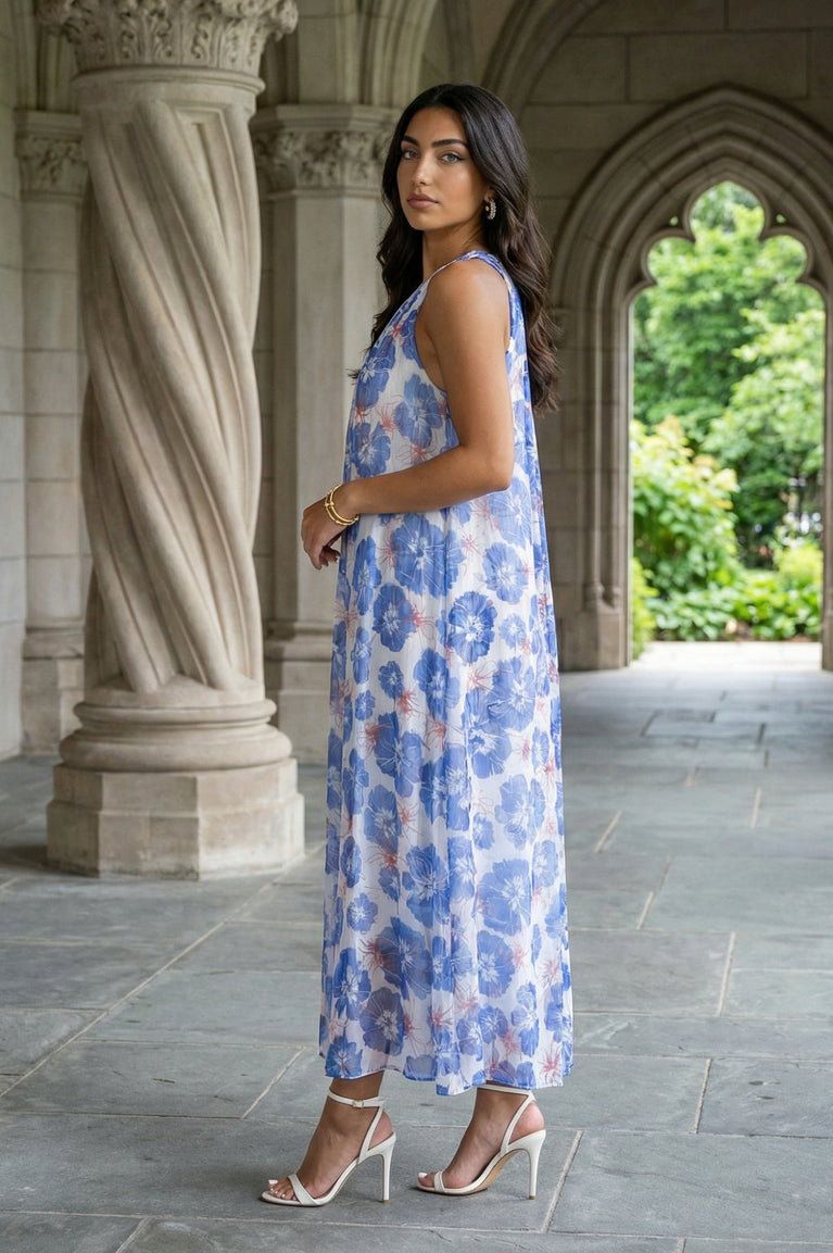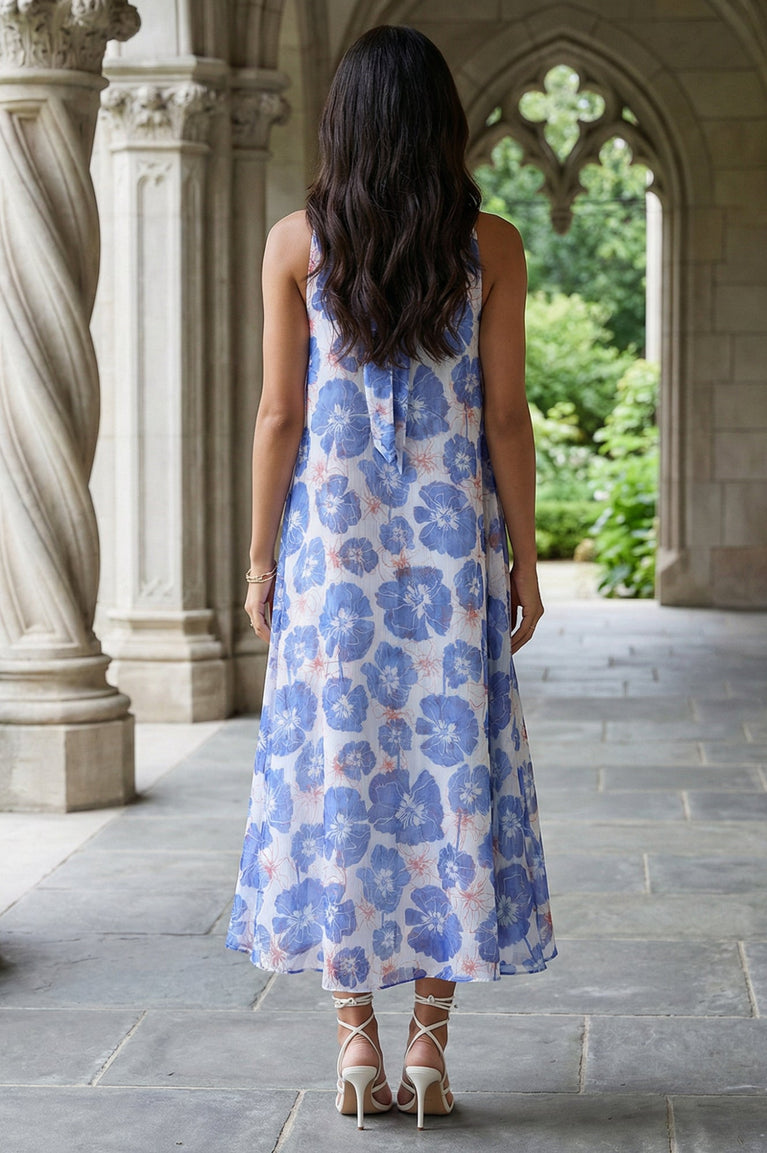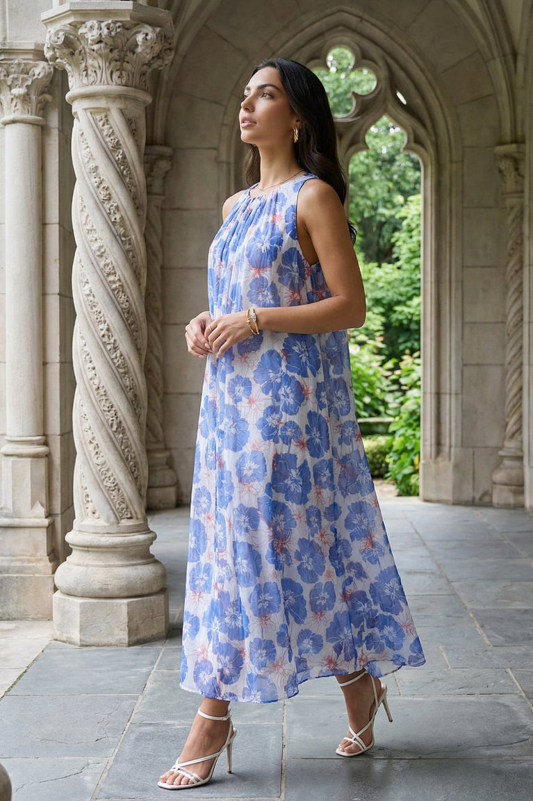 Blue floral printed chiffon A-line dress with a gathered round neckline and a flared calf-length hem for an easy, vacation-ready drape. The sleeveless, slip-on silhouette feels light and airy for summer days, casual outings, and travel, with a semi-sheer finish that suits modern Indian wear styling.