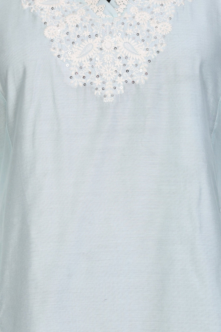 This light blue straight kurta for women by W is crafted from breathable viscose fabric, offering a fluid drape for all-day wear. Adorned with intricate white Chikankari-inspired embroidery and subtle sequin details on the yoke, it features a classic V-neckline and three-quarter sleeves. Ideal for office wear or casual outings, this ethnic staple pairs beautifully with white palazzo pants and traditional jhumkas for a polished, contemporary look.