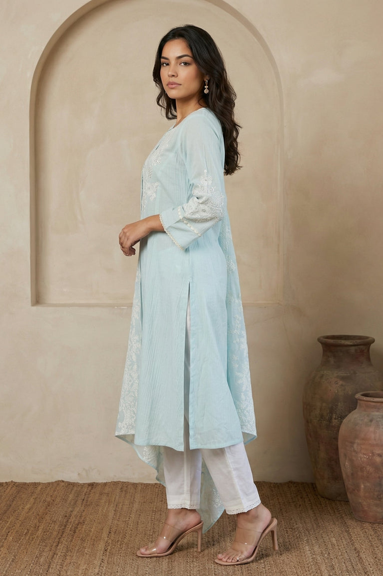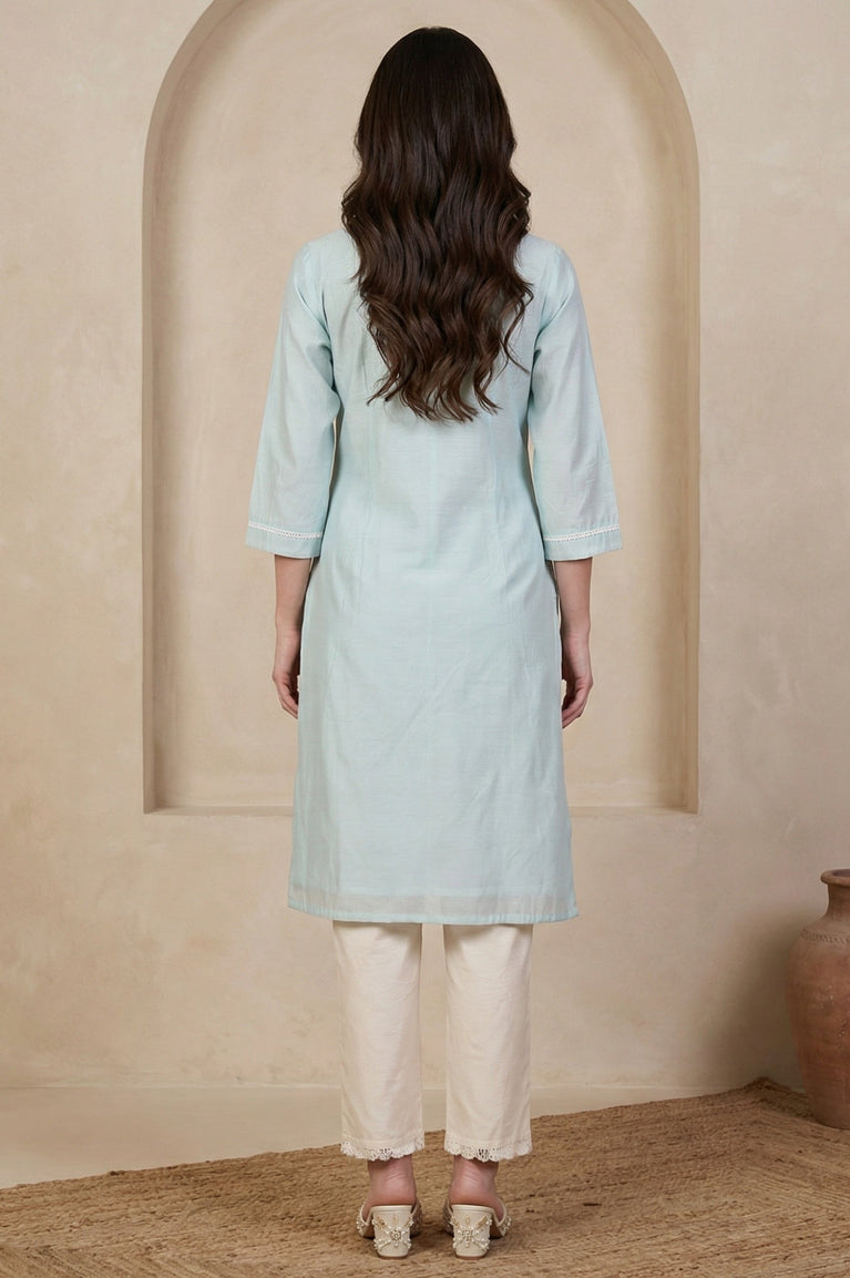 Blue Yarn Dyed Chikankari Embroidered Straight Kurta