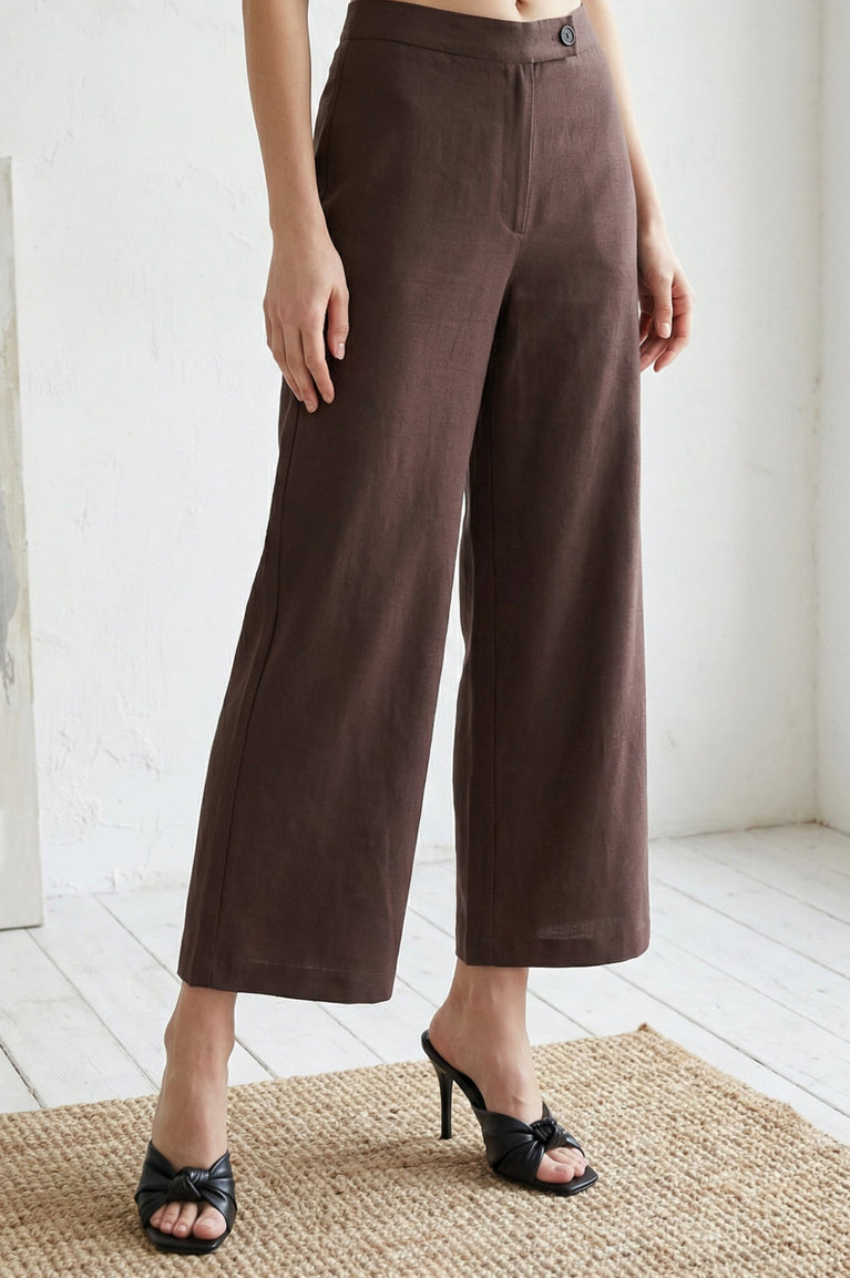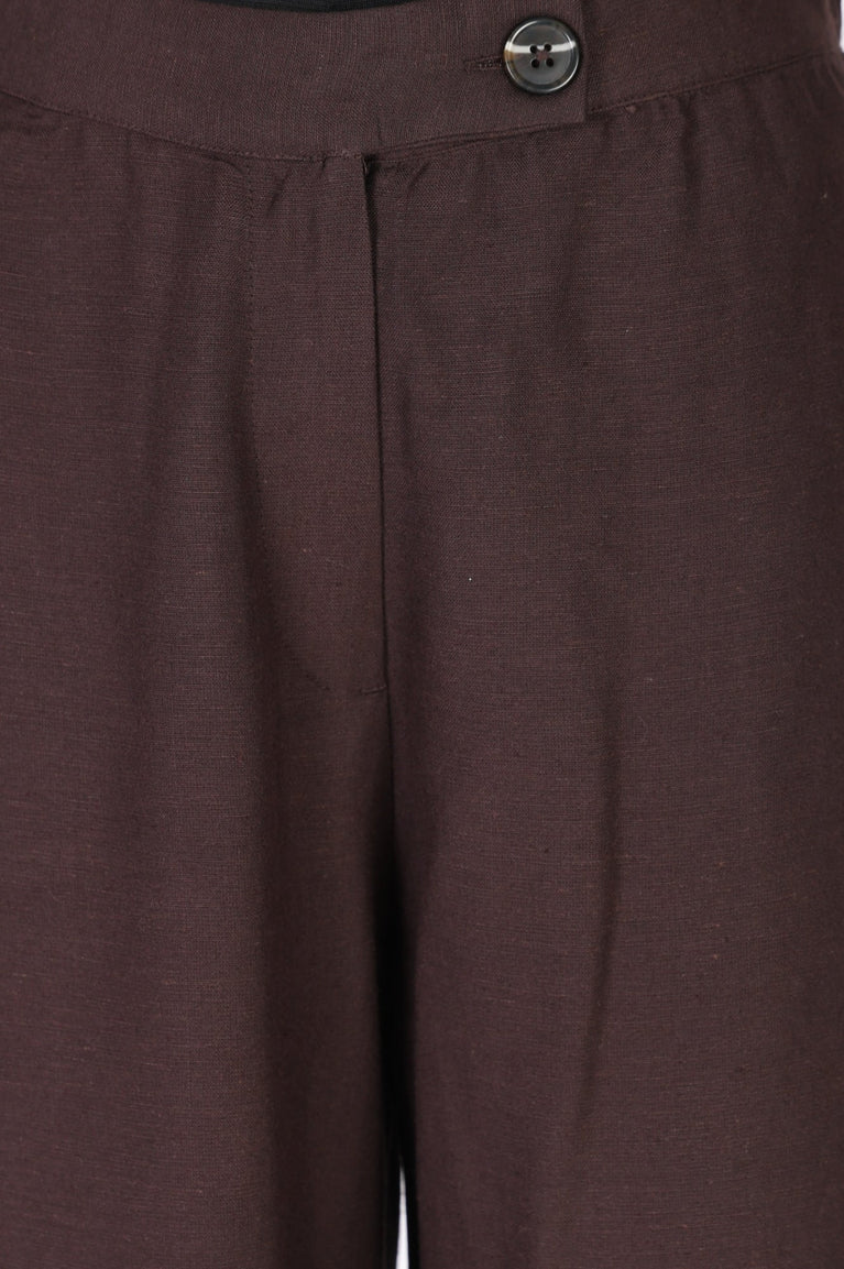 Tailored in a breathable flax blend, these brown wide-leg pants for women offer an effortlessly chic silhouette for both smart casual and relaxed outings. Designed with a high-rise, partially elasticated waist and a flat-front finish, this solid woven palazzo ensures all-day comfort while maintaining a refined look. Featuring an ankle-length cut, neat button details, and four practical pockets, it seamlessly transitions from office wear to casual street style. Pair this minimalist ethnic wear staple with your favorite tops or kurtas for a sophisticated summer ensemble.