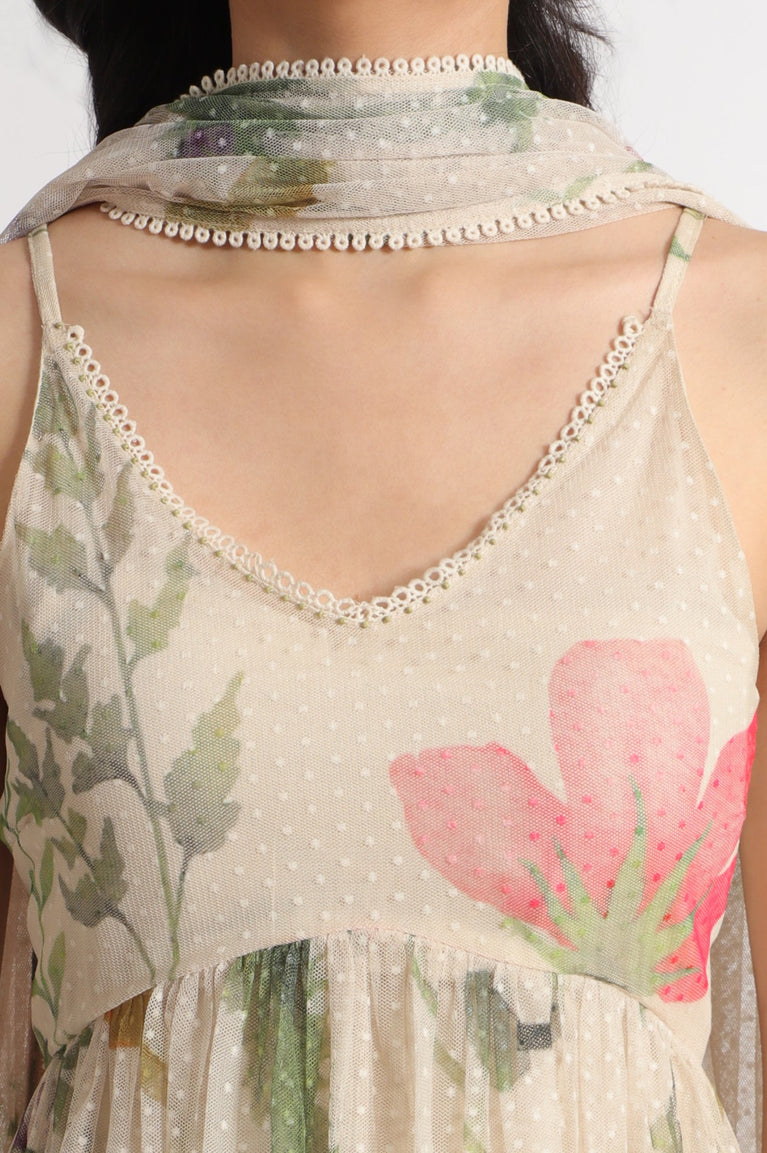 Light Beige Floral Printed Swiss Dot Net Spaghetti Flared Kurta, Pants and Dupatta Set