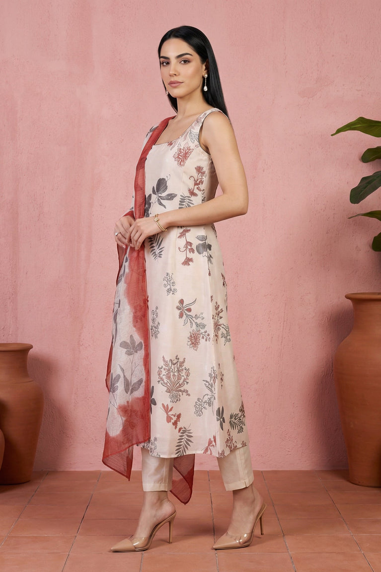 Cream Chanderi floral print A-line kurta set with straight pants and a printed dupatta, finished with subtle embroidery and foil accents. The sleeveless square-neck kurta falls to calf length with side slits for easy movement, while the ankle-length pants keep the look clean and modern. A lightweight pick for casual summer days in Indian ethnic wear.
