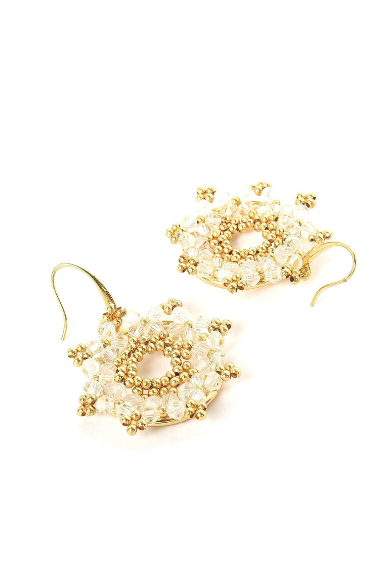 Classic round beige hoop earrings with facated dual tone crystal beads.