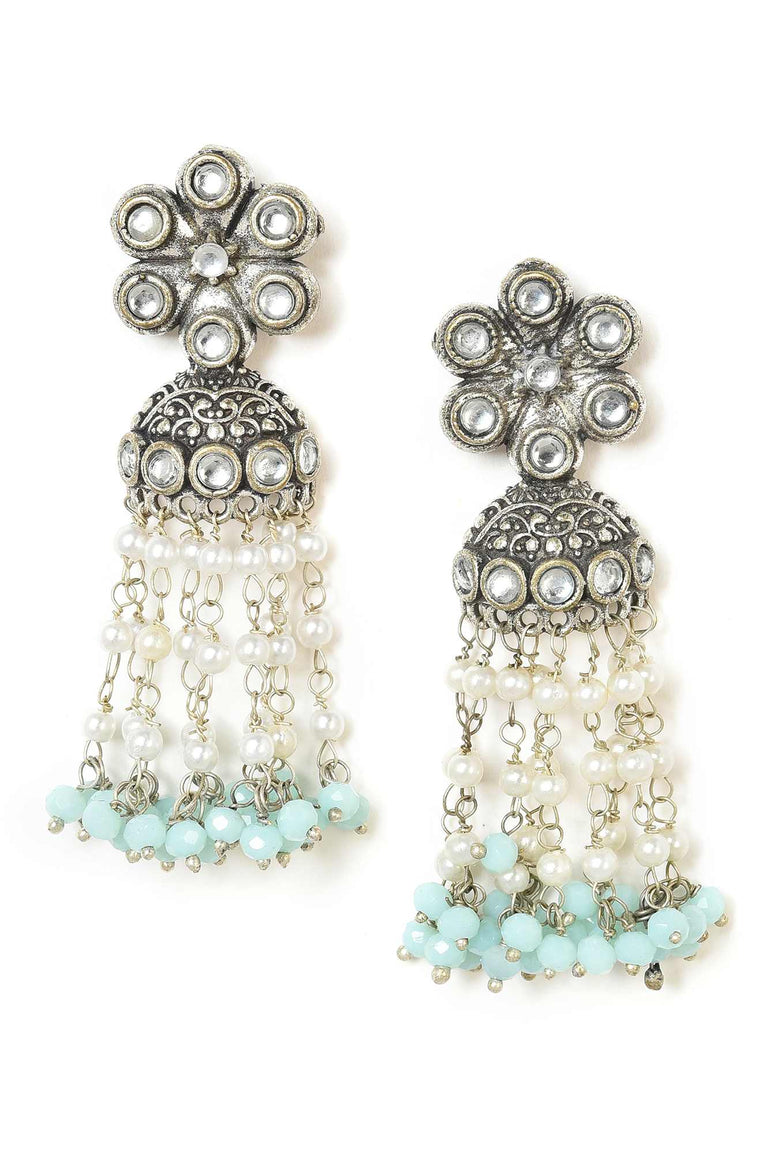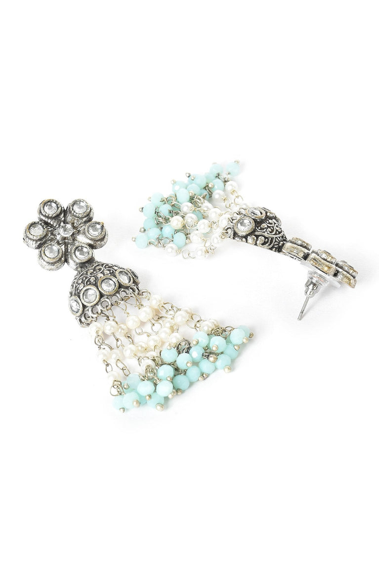 exquisite silver oxidised ethnic motif jhumki earrings studded with blue facted stones