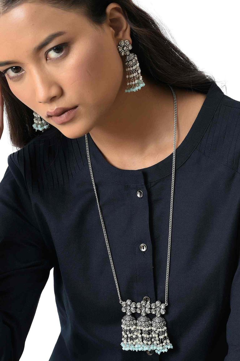 Traditional Silver Oxidised Lariat Necklace Set With Faux Kundan And Blue Crsytal Beads Detailing