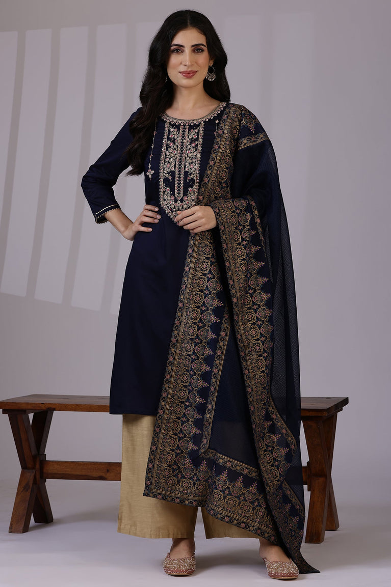 Enhance your ensemble with this stunning blue dupatta from W. Made from 100% man-made fiber, this casual accessory adds a touch of elegance to any outfit. The polyester material ensures durability and easy maintenance, making it perfect for everyday wear. Crafted using a woven construction technique, this dupatta drapes beautifully and complements a variety of looks. The fusion ethnicity of this piece allows for versatile styling options, whether you're dressing up for a casual outing or a festive gathering. The Kota fabric adds a lightweight and breathable quality, perfect for layering. This dupatta is designed to effortlessly elevate your attire, adding a pop of color and sophistication to your ensemble. Embrace the fusion of tradition and modernity with this chic blue dupatta from W's latest collection.