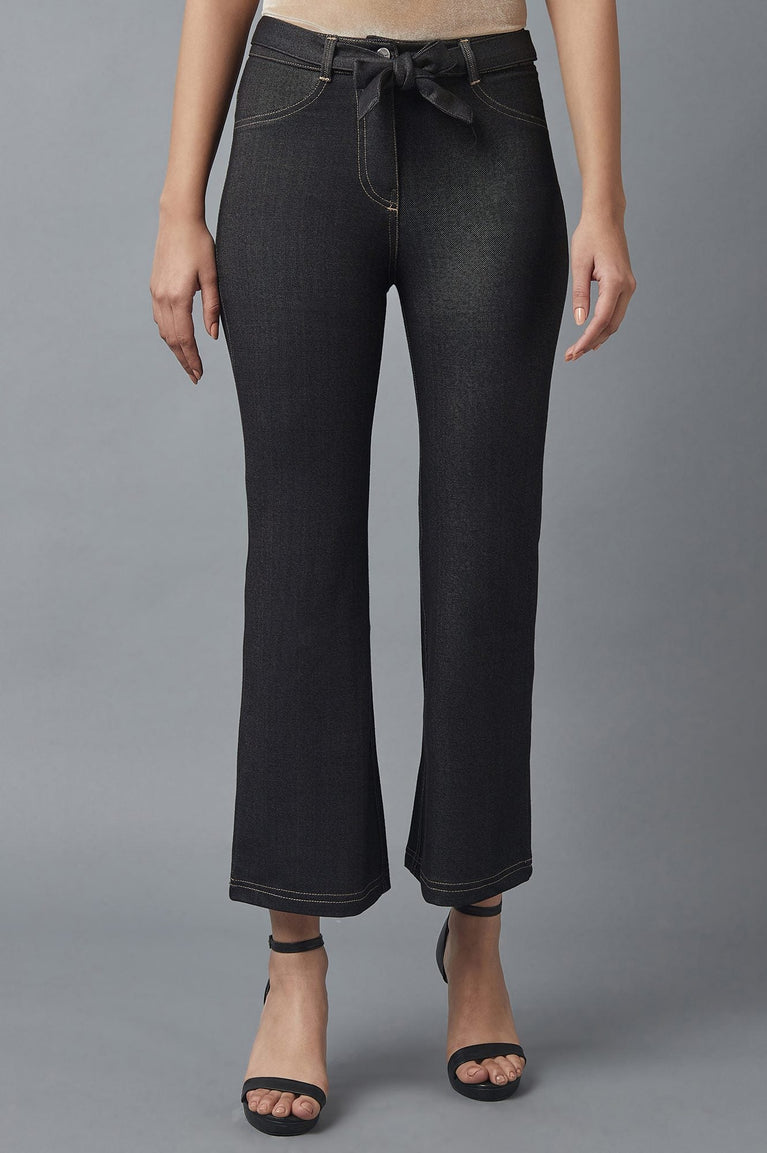 Black Solid Boot Cut Denim Pants With Waist Belt