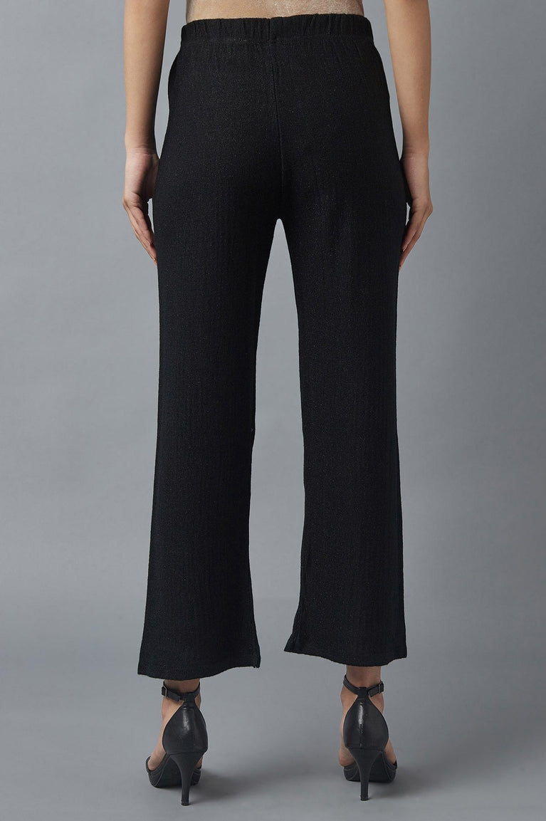 Indulge in cozy sophistication with these black knit palazzos, crafted for effortless style and comfort. The ribbed texture adds a touch of elegance, while the boot-cut silhouette ensures a flattering fit. Designed with an elasticated waistband, these mid-rise palazzos are perfect for casual outings or relaxed evenings. Pair them with winter kurtas or tops for a chic, layered look.