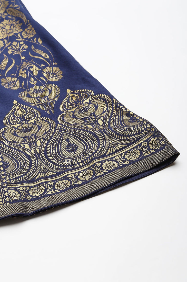 Step into elegance with this navy blue ethnic skirt, adorned with intricate floral prints and a shimmering golden pattern. The flared silhouette offers a graceful drape, while the elasticated waistband ensures a comfortable fit. Crafted from woven fabric, this skirt is perfect for festive occasions, adding a touch of sophistication to your ensemble. Pair it with a crop top or kurta for a stunning light festive look.