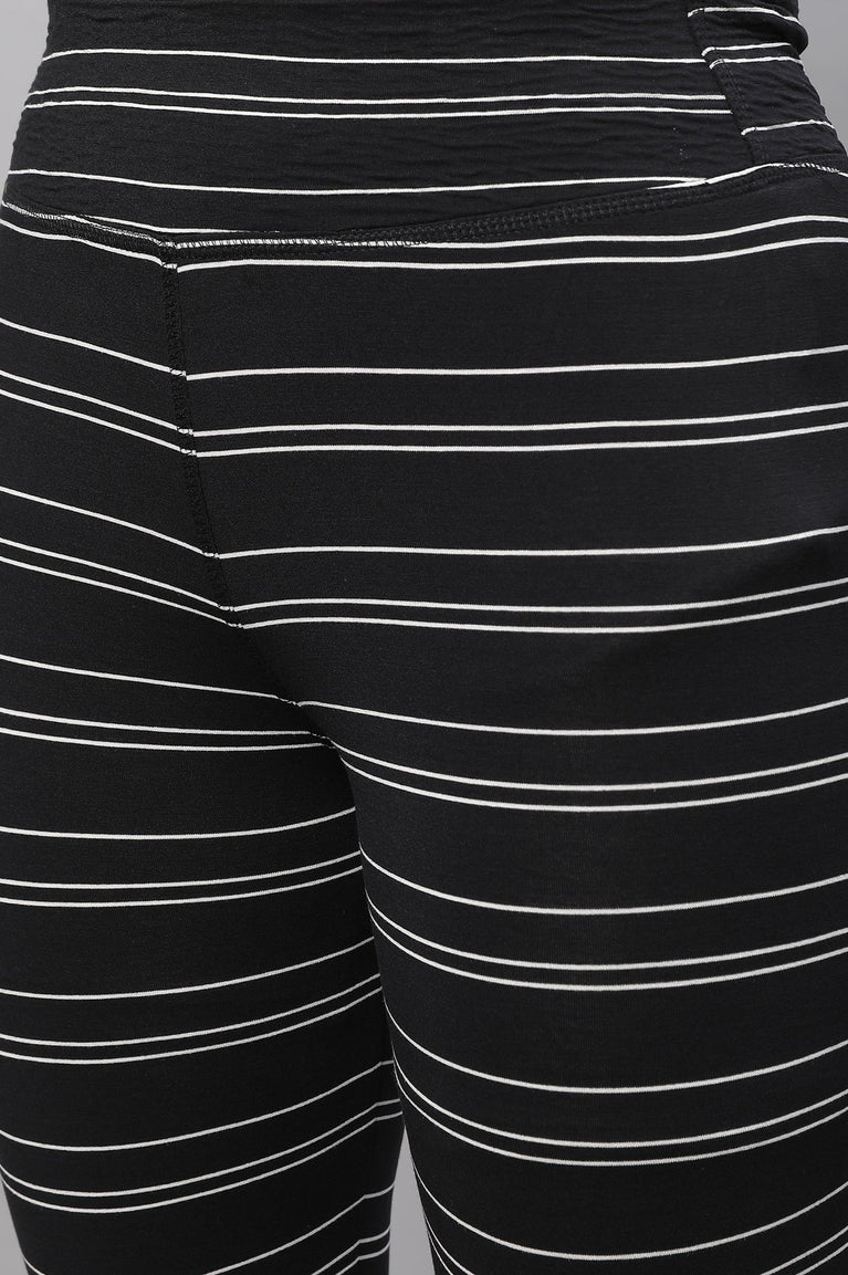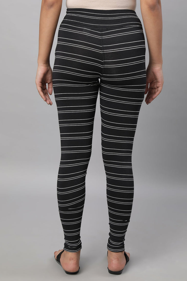 Black Striped Skinny Fit Cotton Tights With High Waistband