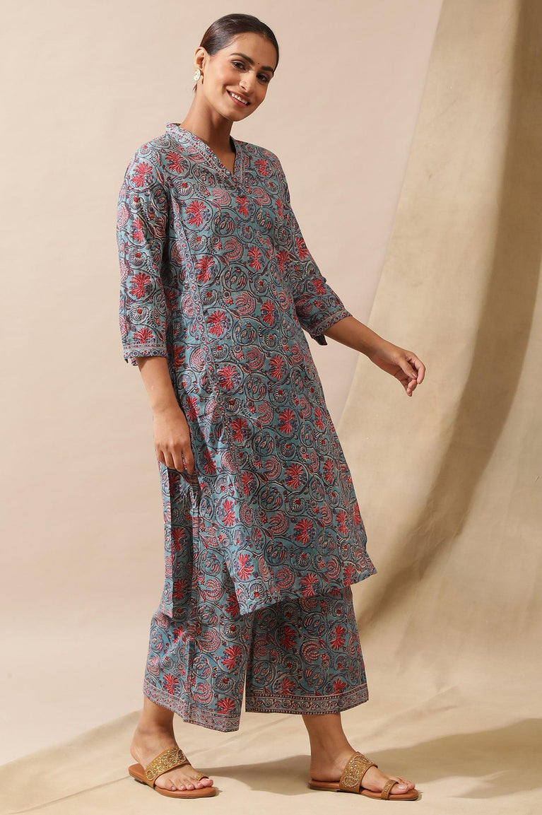 A Bright Floral Multicolored Hand Block Printed Parallel Pants Crafted In Cotton Voile With Border Print At Hem. Finished With Partially Elasticated Waistband.