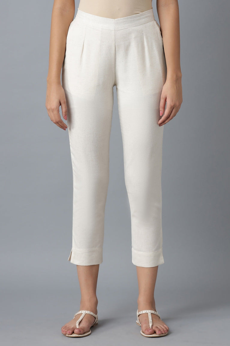 Experience the effortless charm of these beige trousers, designed for a chic and comfy look. The mid-rise waist and partially elasticated waistband ensure a perfect fit, while the ankle length adds a modern touch. Crafted from 100% cotton, these solid trousers feature two front pockets, making them both stylish and practical. Pair them with a kurta and flats for a casual yet sophisticated ensemble.