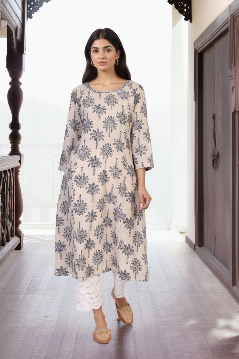 A timeless blend of tradition and style, this beige A-line kurta is adorned with intricate Kalamkari prints and mirror work detailing. The round neckline and 3/4th sleeves add to its charm, while the breathable cotton fabric ensures comfort. Perfect for casual outings or festive gatherings, this kurta is a versatile addition to your wardrobe.