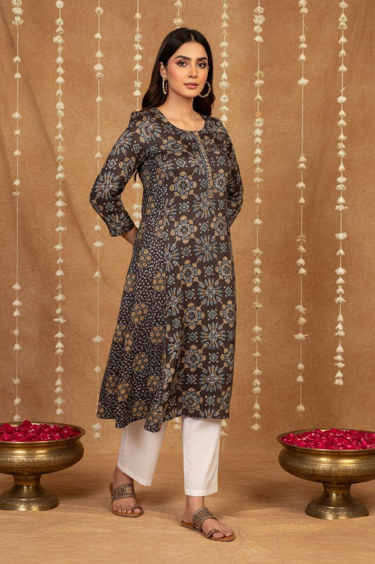 A timeless addition to your wardrobe, this A-line kurta in a rich brown hue features intricate geometric prints that exude elegance. The round neckline and three-quarter sleeves offer a classic silhouette, while the sequined front placket adds a festive touch. Crafted from luxurious modal satin, it ensures a soft drape and all-day comfort. Perfect for festive occasions, casual outings, or semi-formal events, this kurta is a versatile piece that blends traditional charm with modern aesthetics. Pair it with white palazzos or churidar and accessorize with silver jhumkas for a complete look.