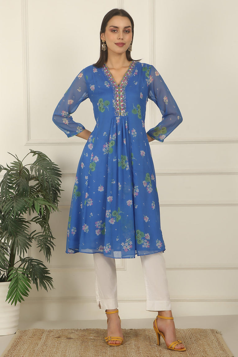 Blue Chiffon Floral Printed Gathered Kurta