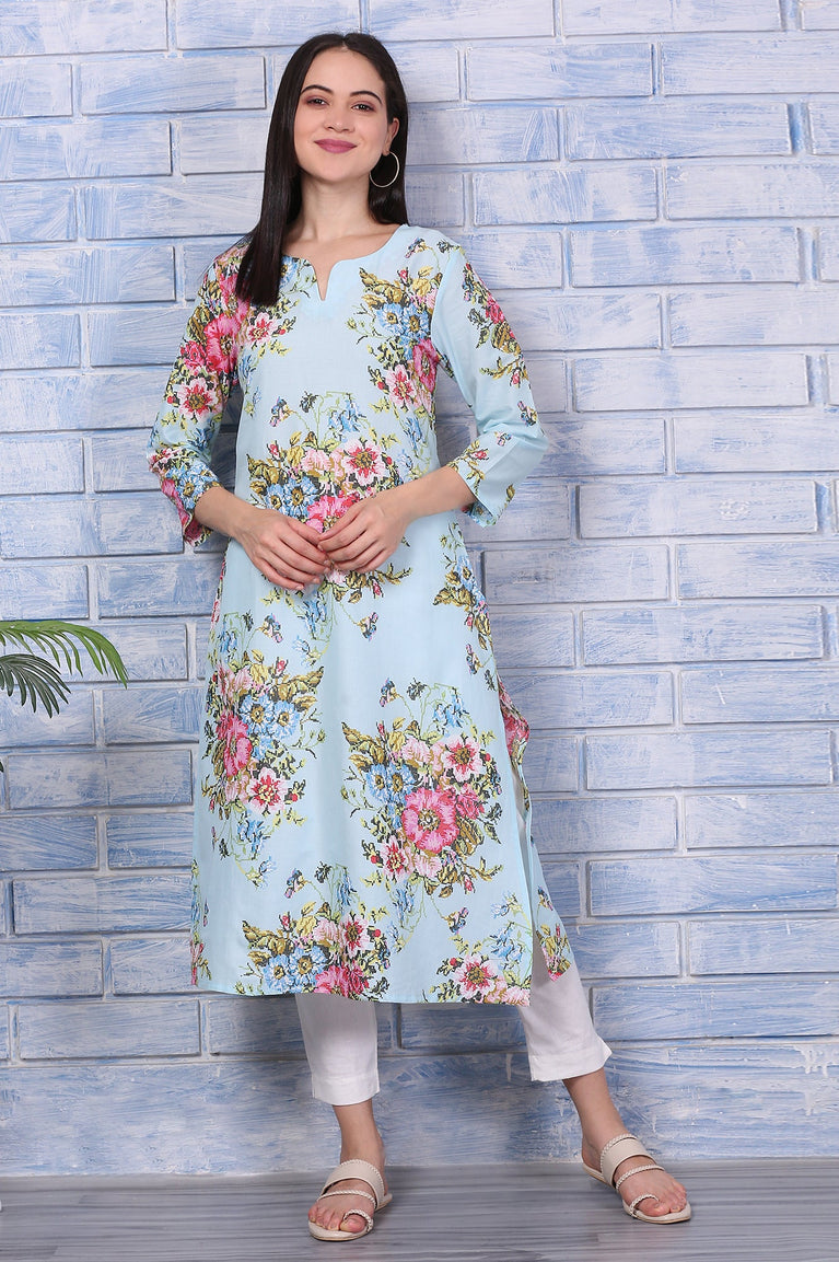 Effortlessly chic and versatile, this blue floral printed straight kurta is crafted from breathable cotton for all-day comfort. The V-neckline and three-quarter sleeves add a touch of elegance, while the straight silhouette ensures a flattering fit. Perfect for casual outings, office wear, or festive occasions, this kurta pairs beautifully with white palazzos or leggings. Its vibrant floral print and lightweight fabric make it a must-have for your wardrobe. Easy to maintain, simply machine wash to keep it looking fresh and stylish.