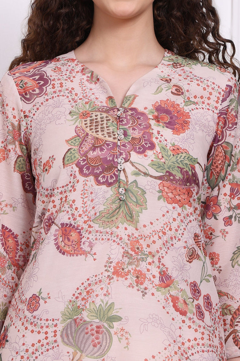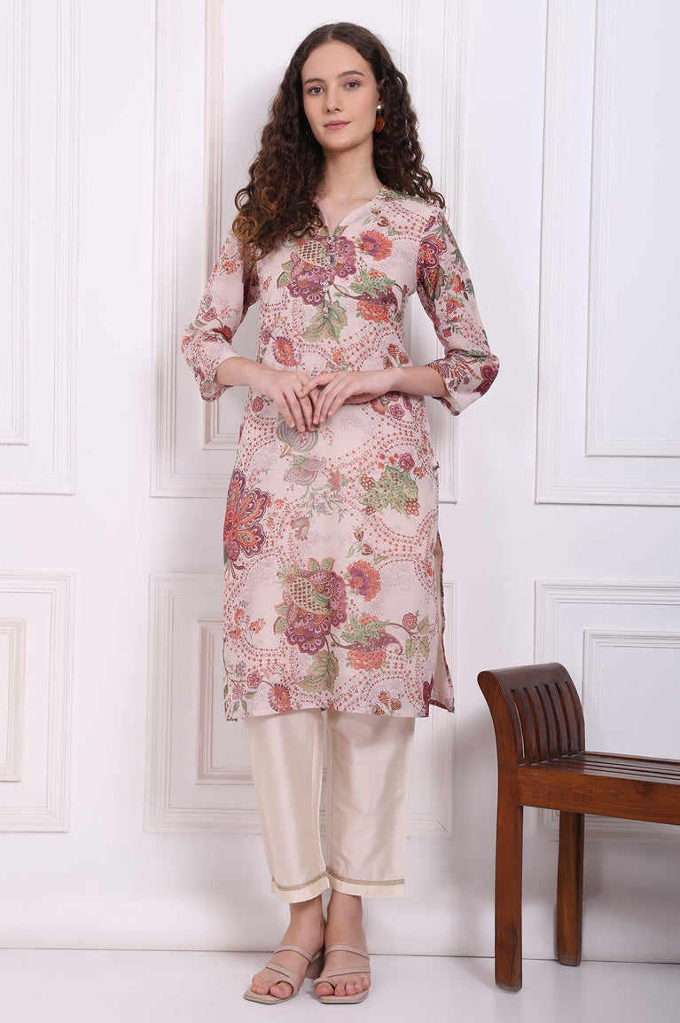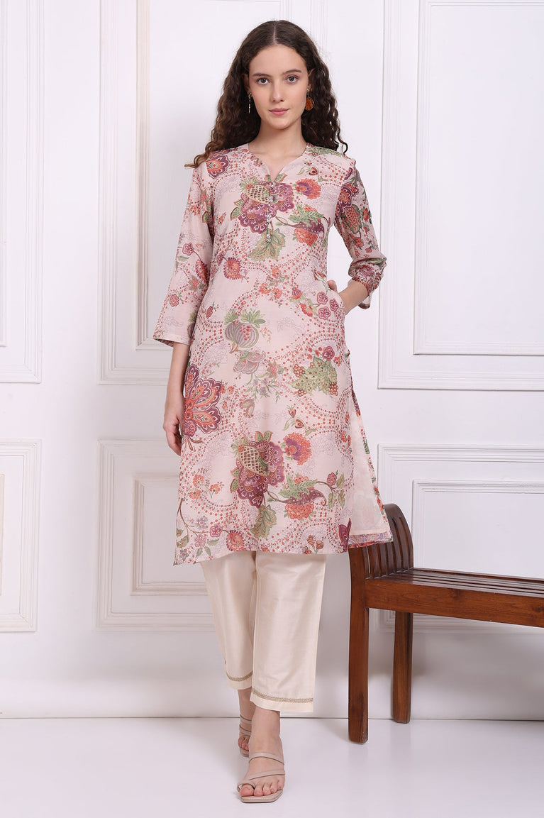 Beige Floral Printed Chanderi Straight Kurta