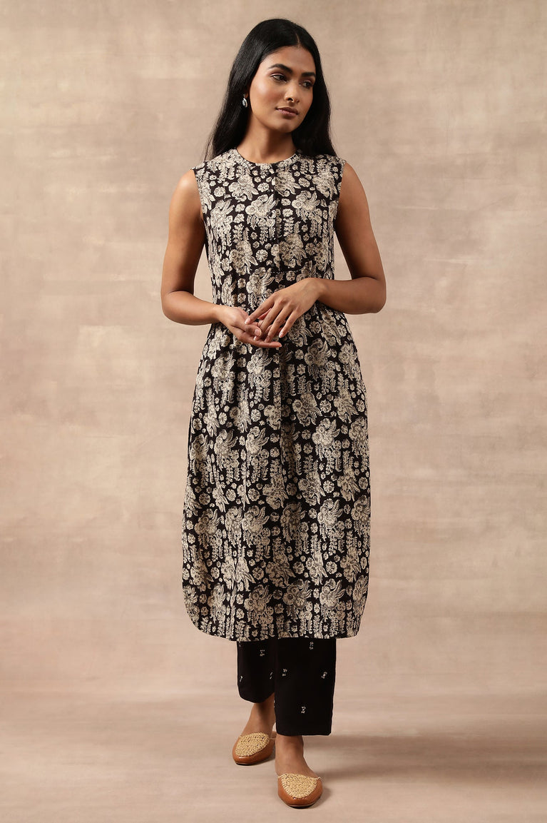 A V-neck flared kurta crafted from meticulously designed handblock print on soft, breathable voile. The neckline and sleeves are accented with border detailing, further enhanced with delicate beadwork. This versatile piece also features side pockets for added functionality.