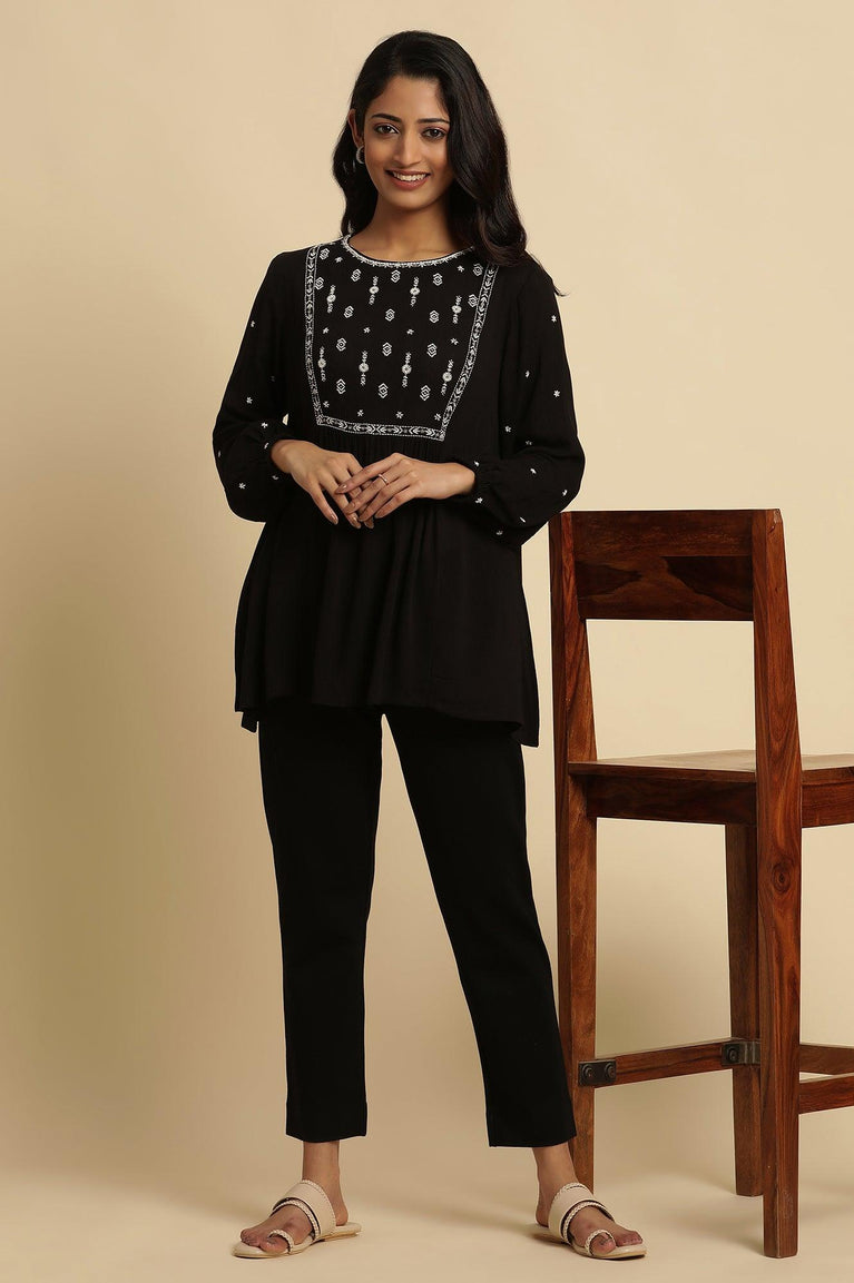 Discover the perfect blend of style and comfort with this fusion top designed for women. Made from 100% rayon, this woven garment offers a soft and breathable feel against the skin. The full-length sleeves provide coverage and versatility, while the boat neckline adds a touch of sophistication. The a-line silhouette flatters various body types, creating a graceful and feminine look. Embellished with intricate embroidery, this black top exudes elegance and charm. Ideal for casual occasions, it can be easily dressed up or down to suit your needs. The rayon fabric ensures excellent drape and movement, making it a comfortable choice for all-day wear. Pair this versatile top with jeans, skirts, or palazzo pants to create numerous stylish outfits for any casual event.