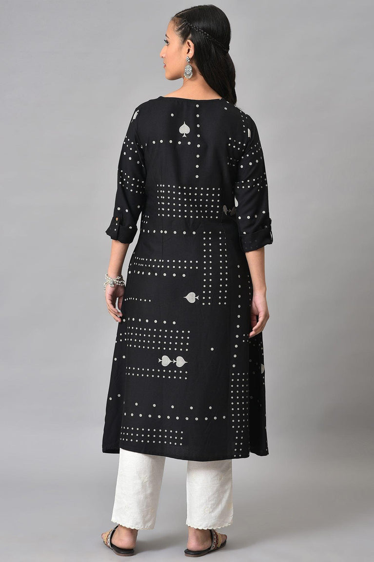 Black Geometric Print A-Line Kurta. The Kurta Features A Captivating Placement Print And Mandarin Collar Detail.