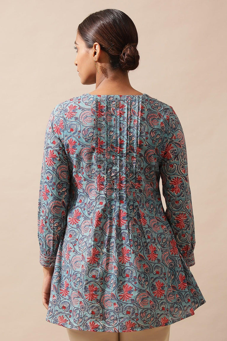 Blue Block Print Mirror Work Straight Cotton Kurta