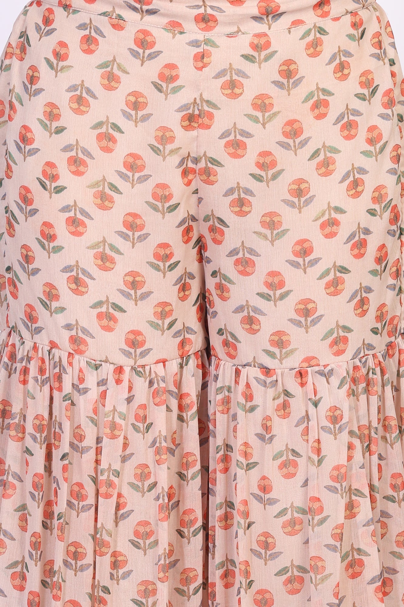 A vision of garden-party grace, this kurta set for women captures the essence of breezy sophistication. Rendered in a delicate Peach Bloom hue, the ensemble pairs a chic peplum kurta with beautifully tiered sharara pants and a coordinating chiffon dupatta. This exquisite sharara suit is designed for moments that call for a touch of artistry. The round neckline and three-quarter sleeve cuffs are thoughtfully detailed with subtle sequin and beadwork, adding a hint of shimmer. Crafted from airy chiffon, the floral print kurta glides with every movement, its layered peplum hem creating a flattering, playful silhouette. You'll love the effortless elegance of this ethnic co-ord set, where the flowing tiered sharara pants create a dramatic yet graceful look. This complete kurti set, including the lightweight printed dupatta with its own distinct border, is your perfect companion for festive gatherings and daytime celebrations. It’s a beautifully composed look that feels both timeless and utterly modern.