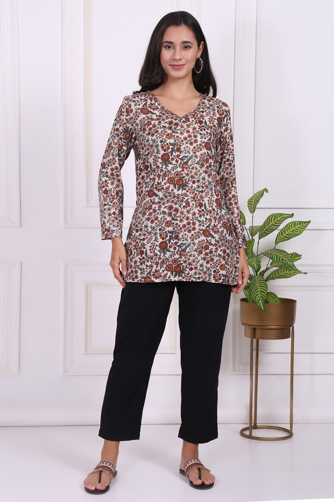 Step into effortless style with this beige floral printed tunic. The straight silhouette and V-neckline create a flattering look, while the long sleeves add a touch of elegance. Perfect for casual outings or office wear, this tunic is crafted from soft viscose fabric for all-day comfort. Pair it with black trousers or jeans for a chic winter ensemble.