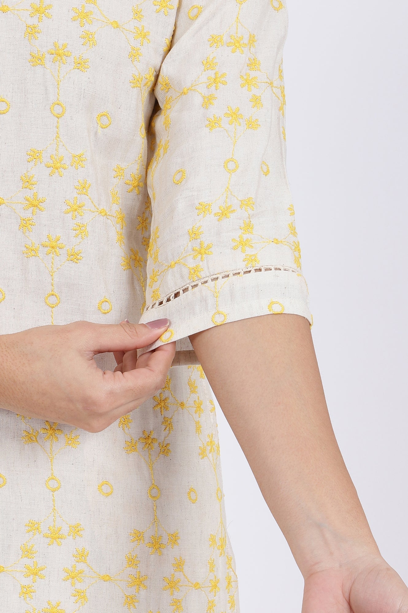 Beige Schiffli Embroidered Straight Rayon Flax Kurta