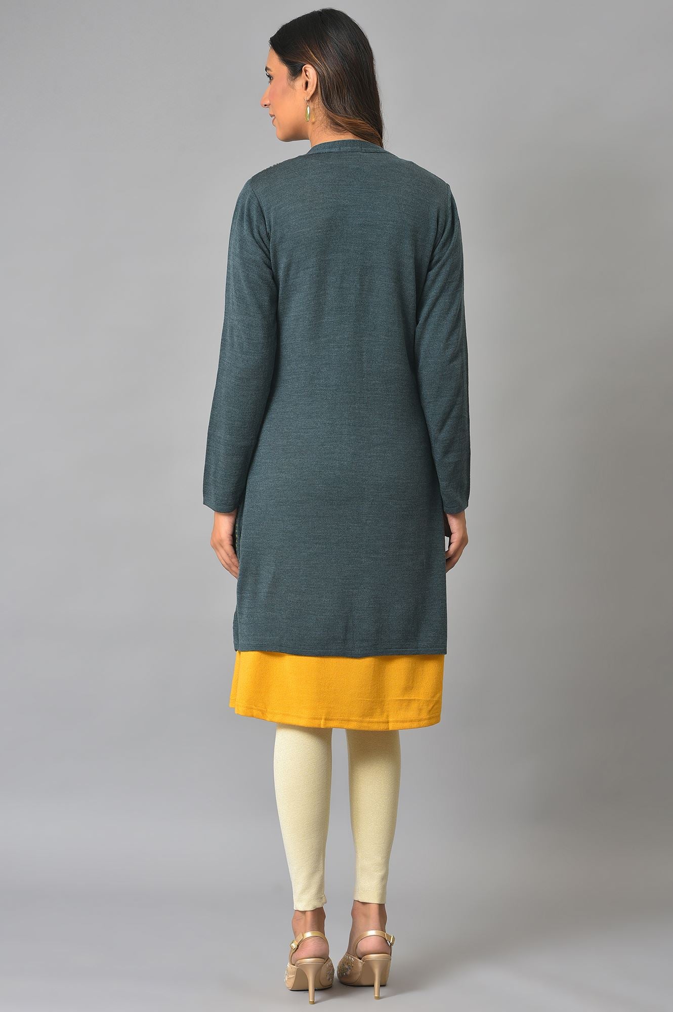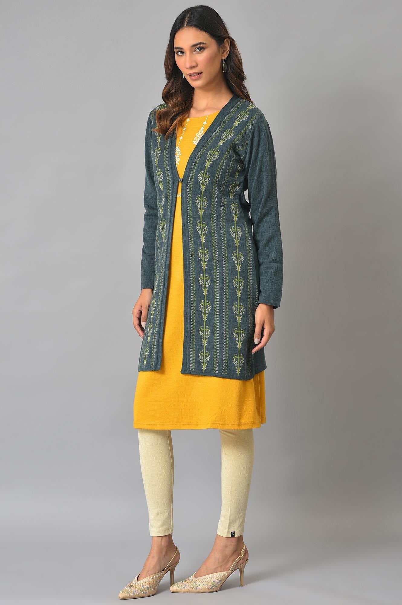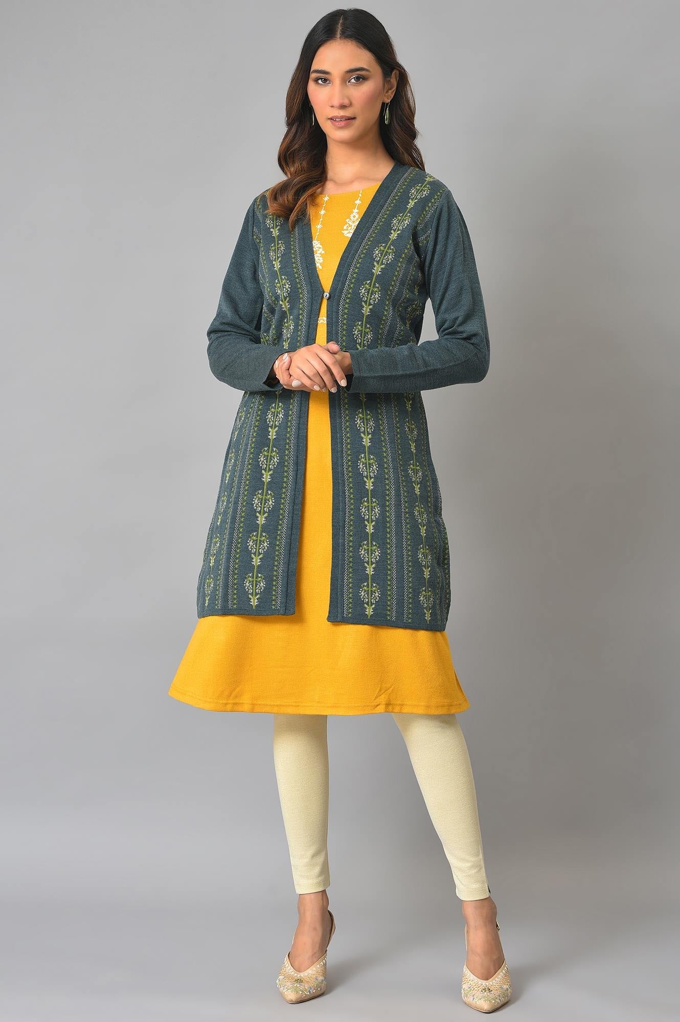 Atlantic Deep Mid Length Jaquard Cardigan With Vertical Floral Pattern And Front Single Button Detail