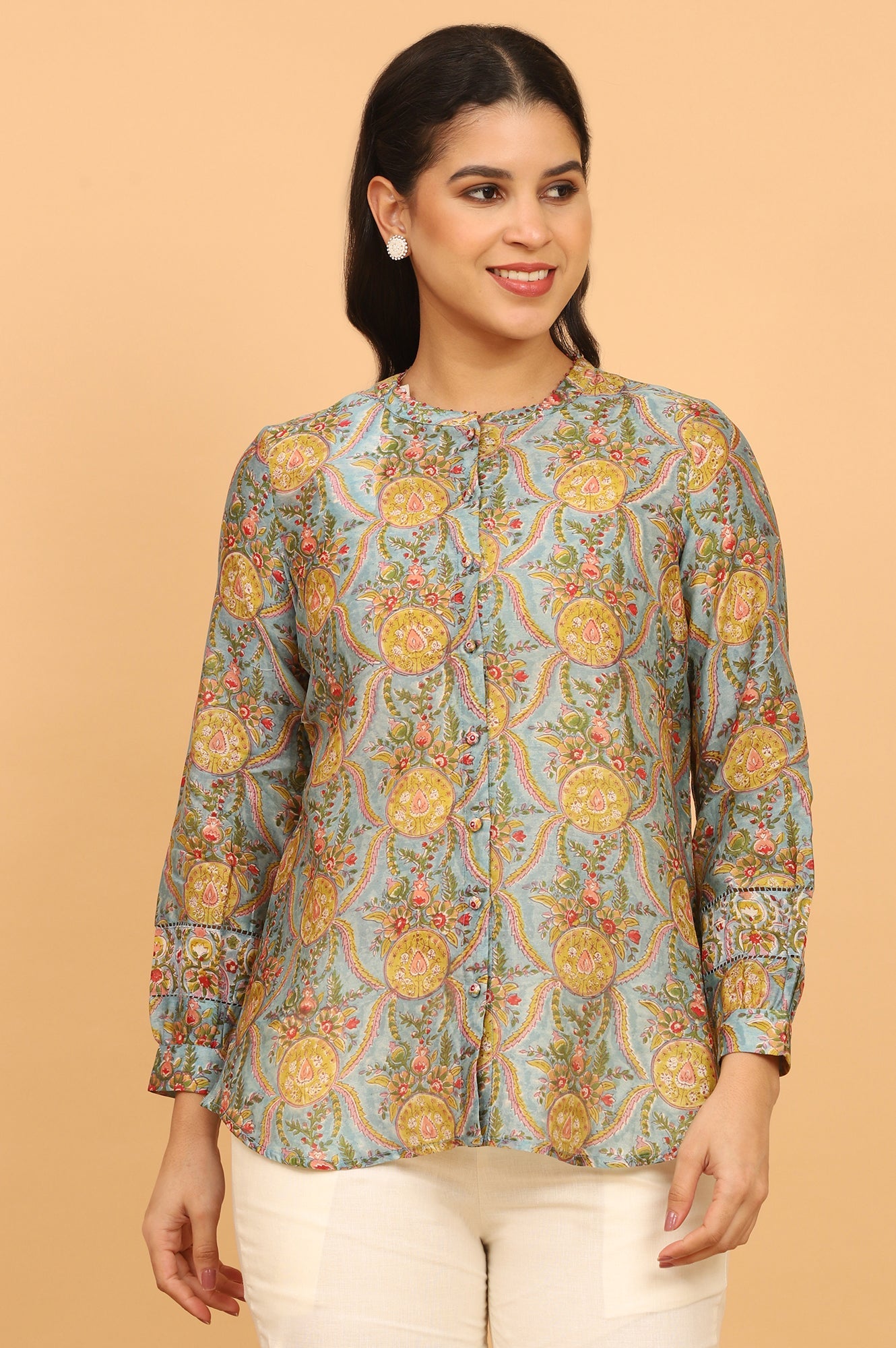 A shirt crafted in handblock printed cotton silk, features border detail at sleeves.