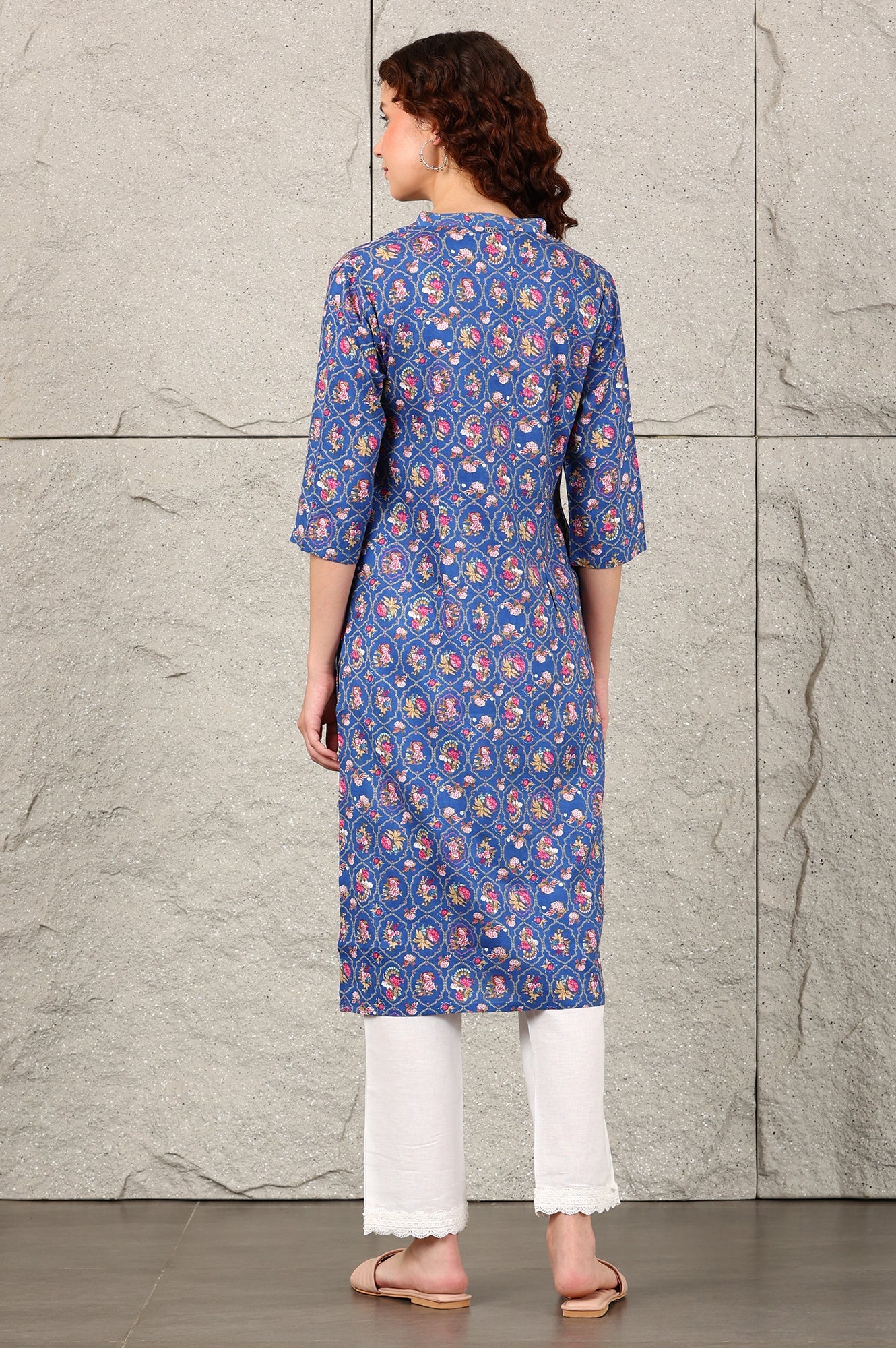 The blue floral printed kurta exudes understated charm with its delicate floral pattern and intricate lace V-neckline. The straight-cut silhouette ensures a flattering fit, while the lace detailing adds a touch of sophistication, making it a timeless and elegant choice.