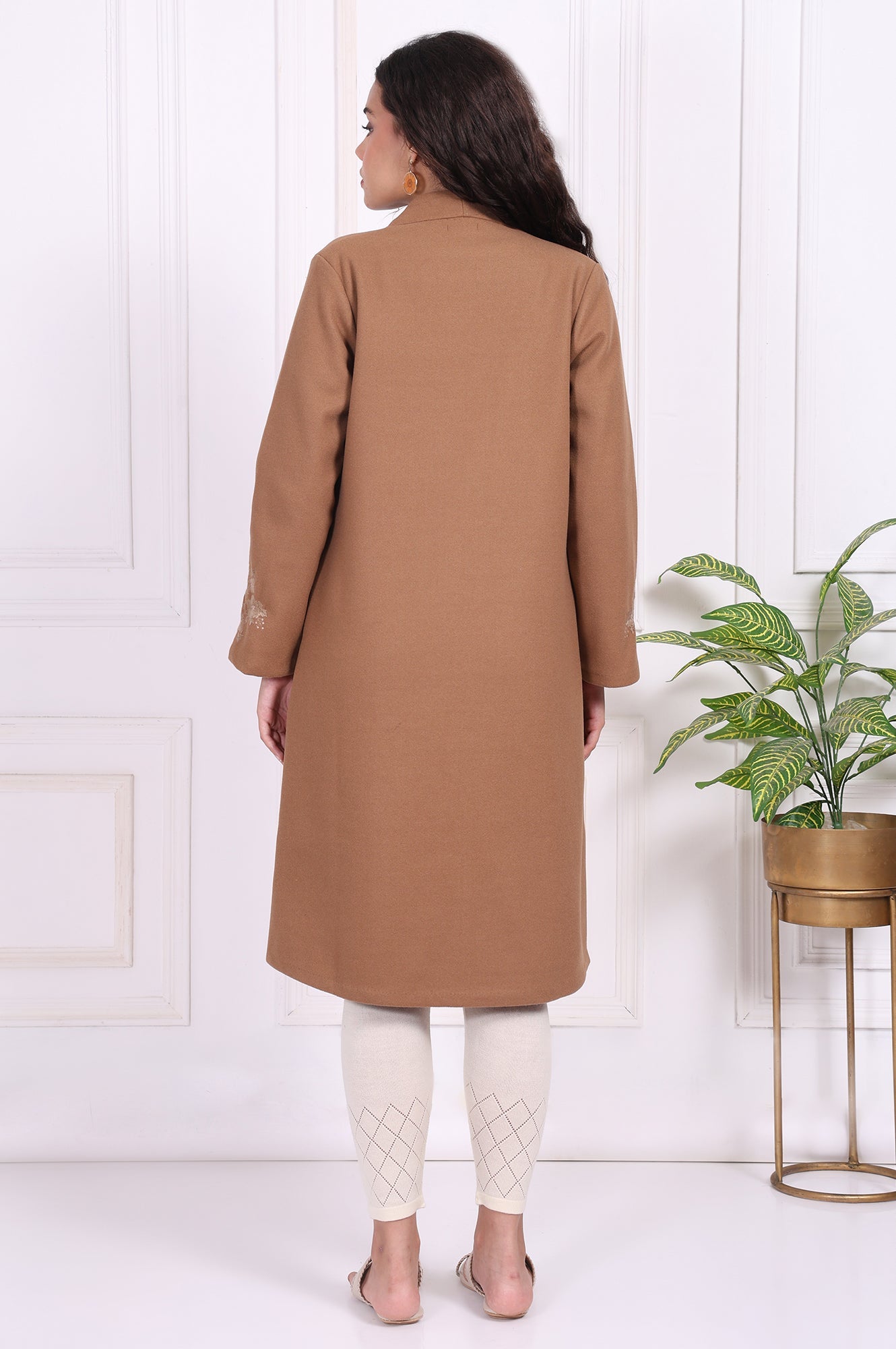 Step into the season with this elegant camel brown straight coat for women. Featuring an open front design and delicate embroidered sleeves, this coat is crafted from woven fabric for warmth and durability. Its straight silhouette and medium brown shade make it a versatile addition to your wardrobe, perfect for both casual outings and formal gatherings. Pair it with leggings or trousers for a chic and cozy look this winter.