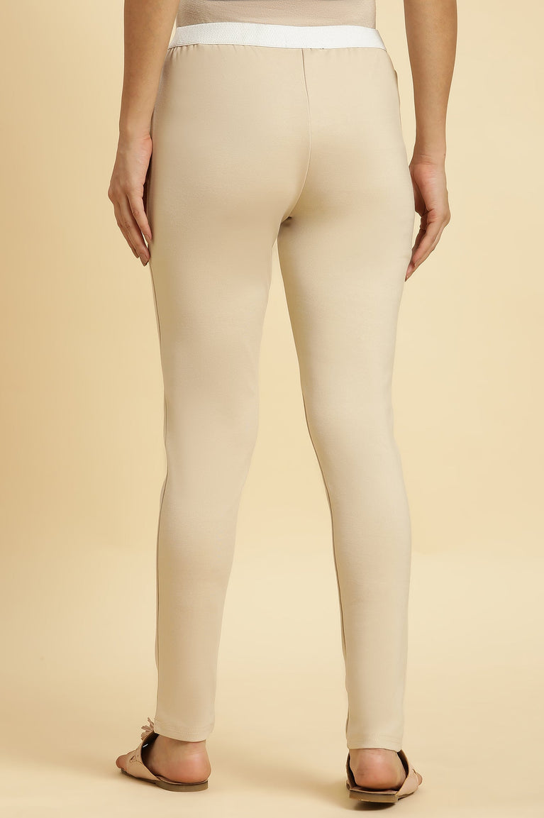 Beige Solid Thread Embroidered Rayon Asymmetric Kurta and Slim Pant Set