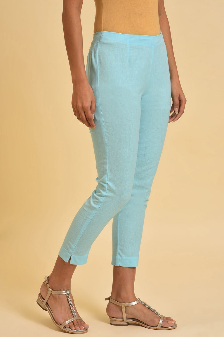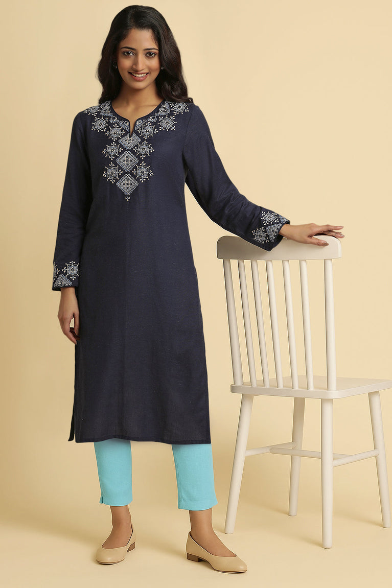 Blue Solid Thread Work Rayon Flax Straight Kurta and Slim Pant Set