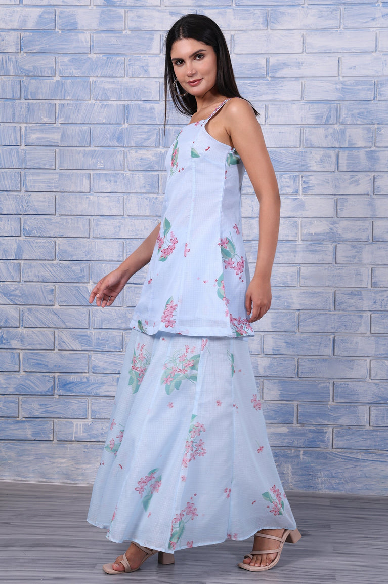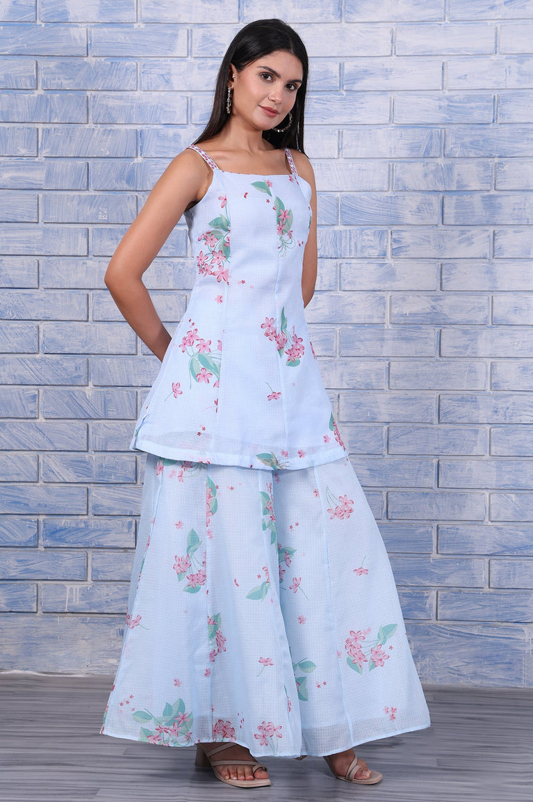 A celebration of texture and print, this flared kurta set is crafted from airy Kota fabric. The soft blue floral print meets fine thread embroidery, giving it an artistic edge. The voluminous silhouette of both the kurta and flared pants allows for movement and drama, while the lightweight fabric ensures comfort throughout the day. This three-piece set includes a coordinating dupatta, making it ideal for daytime celebrations, haldi events, or family luncheons.