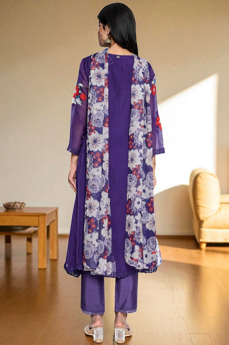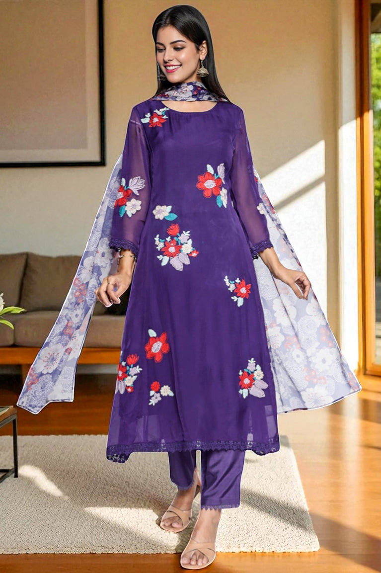Amesthyst Purple Solid Printed Organza A-Line Kurta, Straight Pant and Dupatta Set