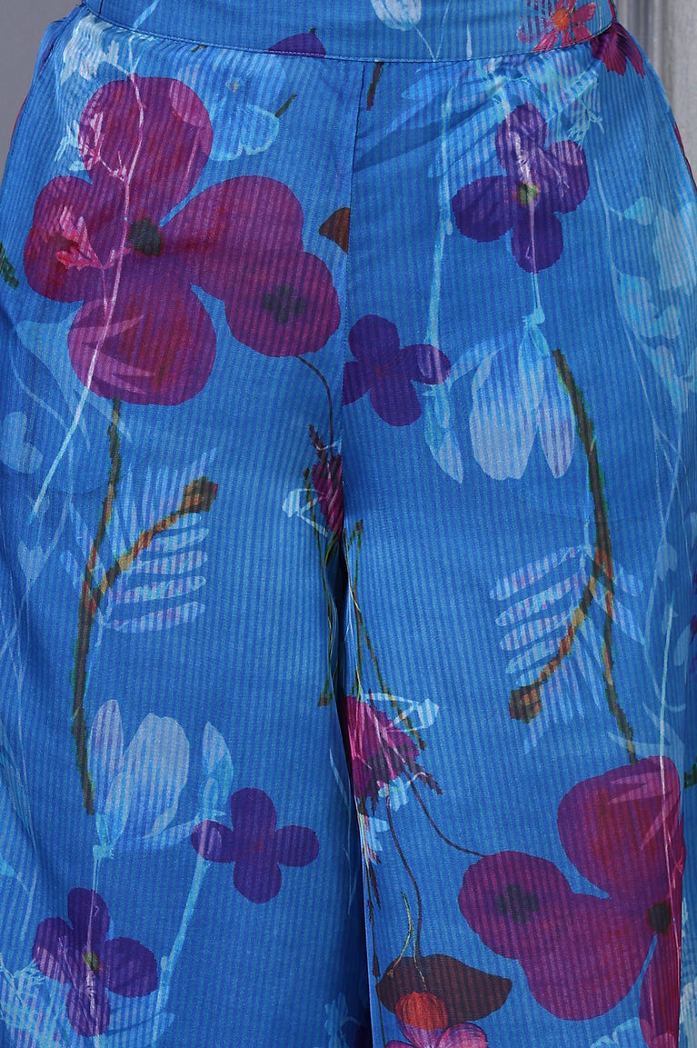 Blue Floral Printed Beads Chiffon Flared Crop Top, Jacket and Flared Pants Set