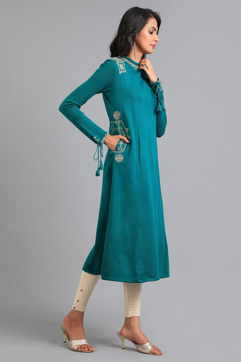 Aqua Mint Thread Embroidered Silk Chanderi Flared Kurta, Straight Pant and Dupatta Set