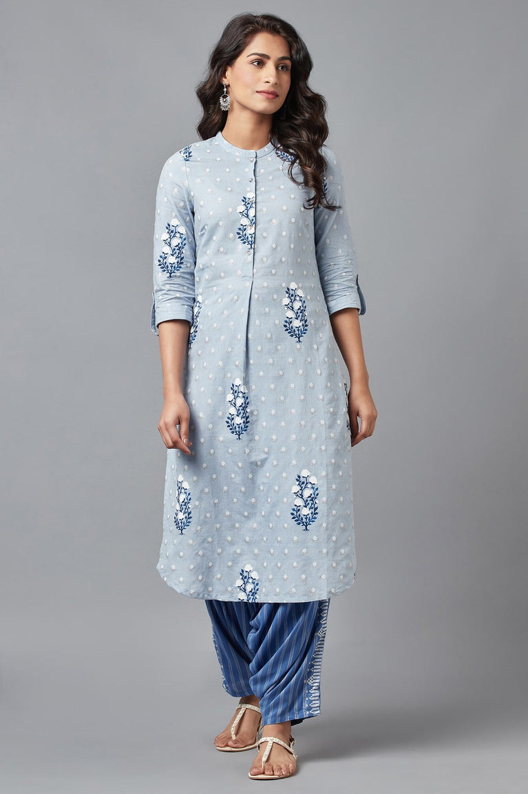 Elevate your ethnic wardrobe with this exquisite blue kurta designed for women. Crafted from pure cotton, this woven piece offers both comfort and style for casual occasions. The embroidered details add a touch of elegance, while the three-quarter sleeves provide a perfect balance between traditional and contemporary aesthetics. The square neckline frames the face beautifully, complementing the straight silhouette of the kurta. Made from 100% cotton, this garment ensures breathability and ease of wear. The blue hue makes it a versatile addition to your wardrobe, easily paired with various bottoms for a complete look. This kurta seamlessly blends traditional craftsmanship with modern design, making it an ideal choice for those who appreciate ethnic fashion with a contemporary twist.
